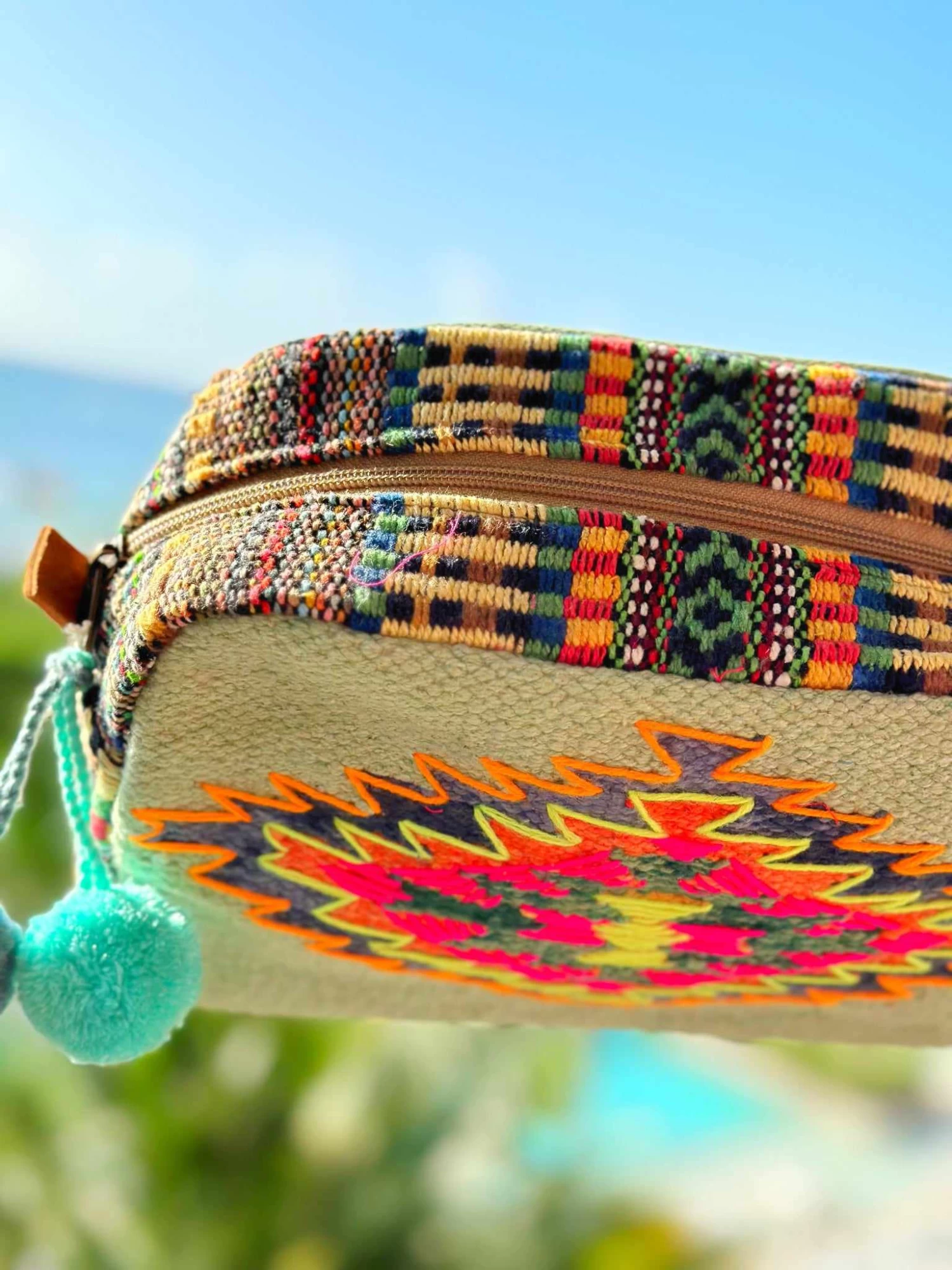 The perfect western style cosmetics bag! With plenty of storage for all your makeup and beauty needs, this bag features a natural canvas material, side pocket, and cute pom pom zipper charm!