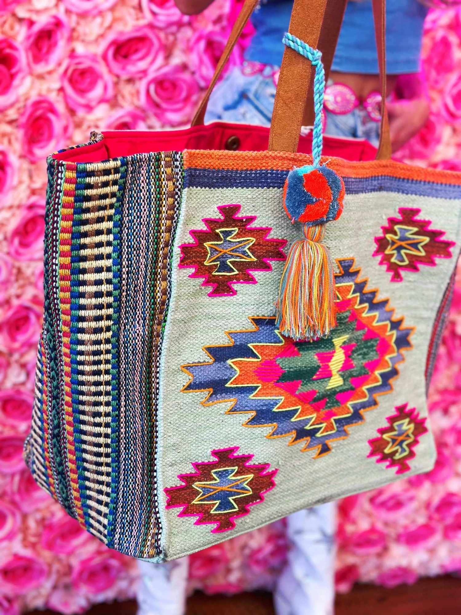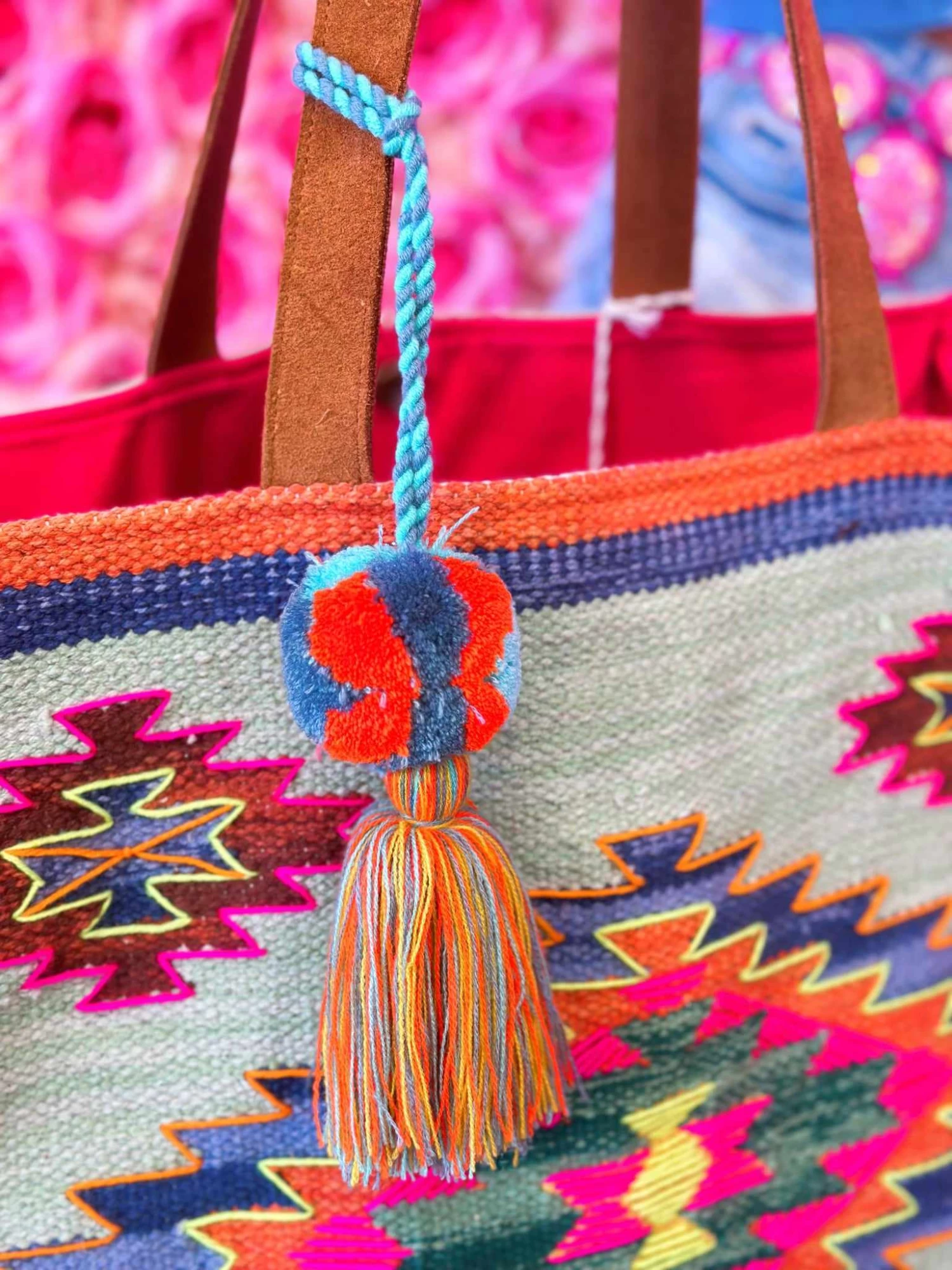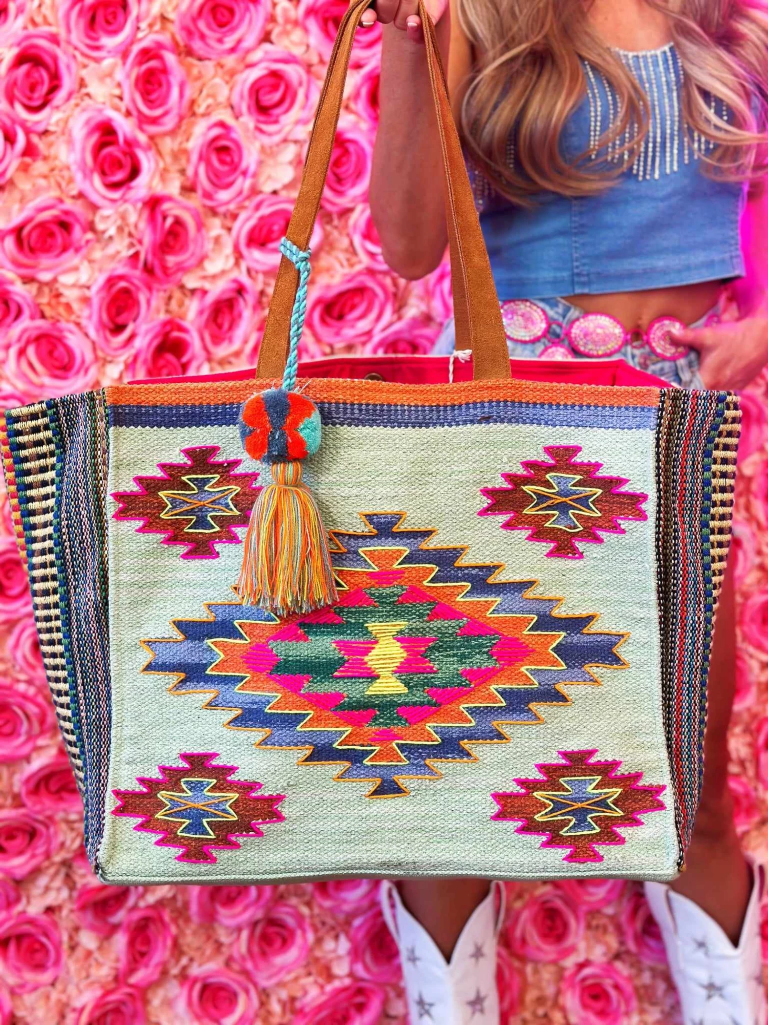 Adventure awaits when you throw this western style tote bag over your shoulder! The perfect toteĀ to bring along on your summer vacay, this tote bagĀ has tons of storage to carry everything you need far from home. Featuring an aztec print, canvas material, andĀ festive pom pom handle charm.