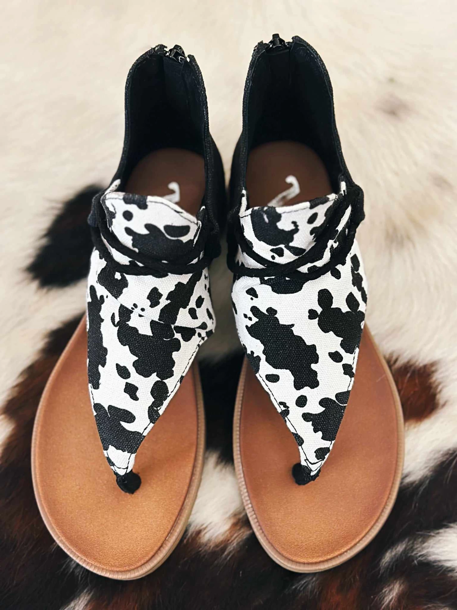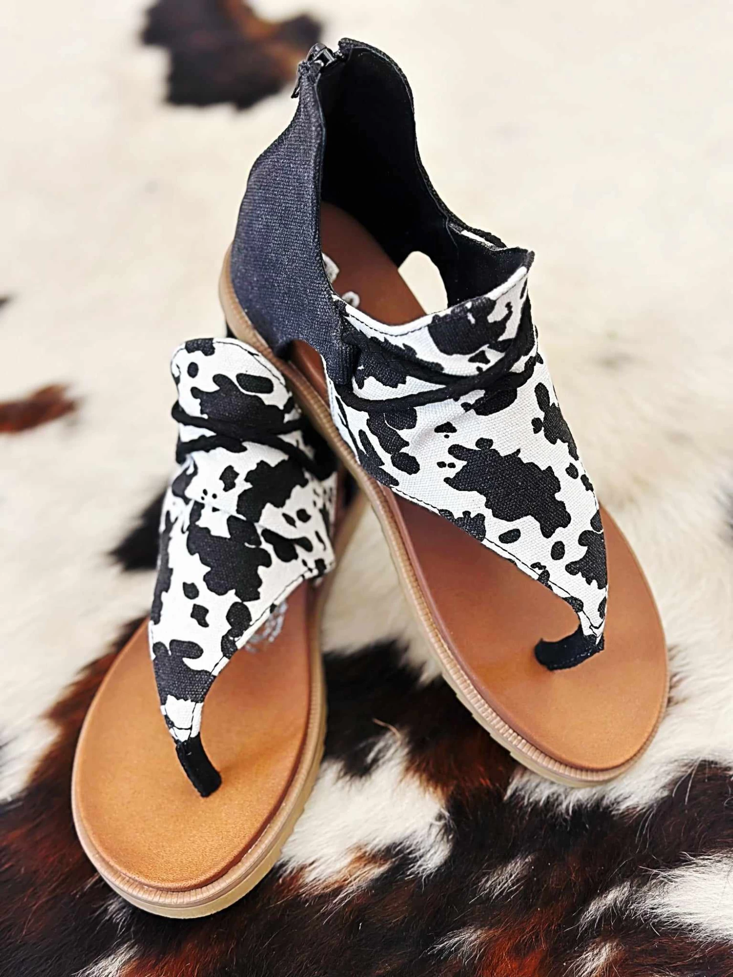 Black Cow Print Thong Sandal with Zipper Back