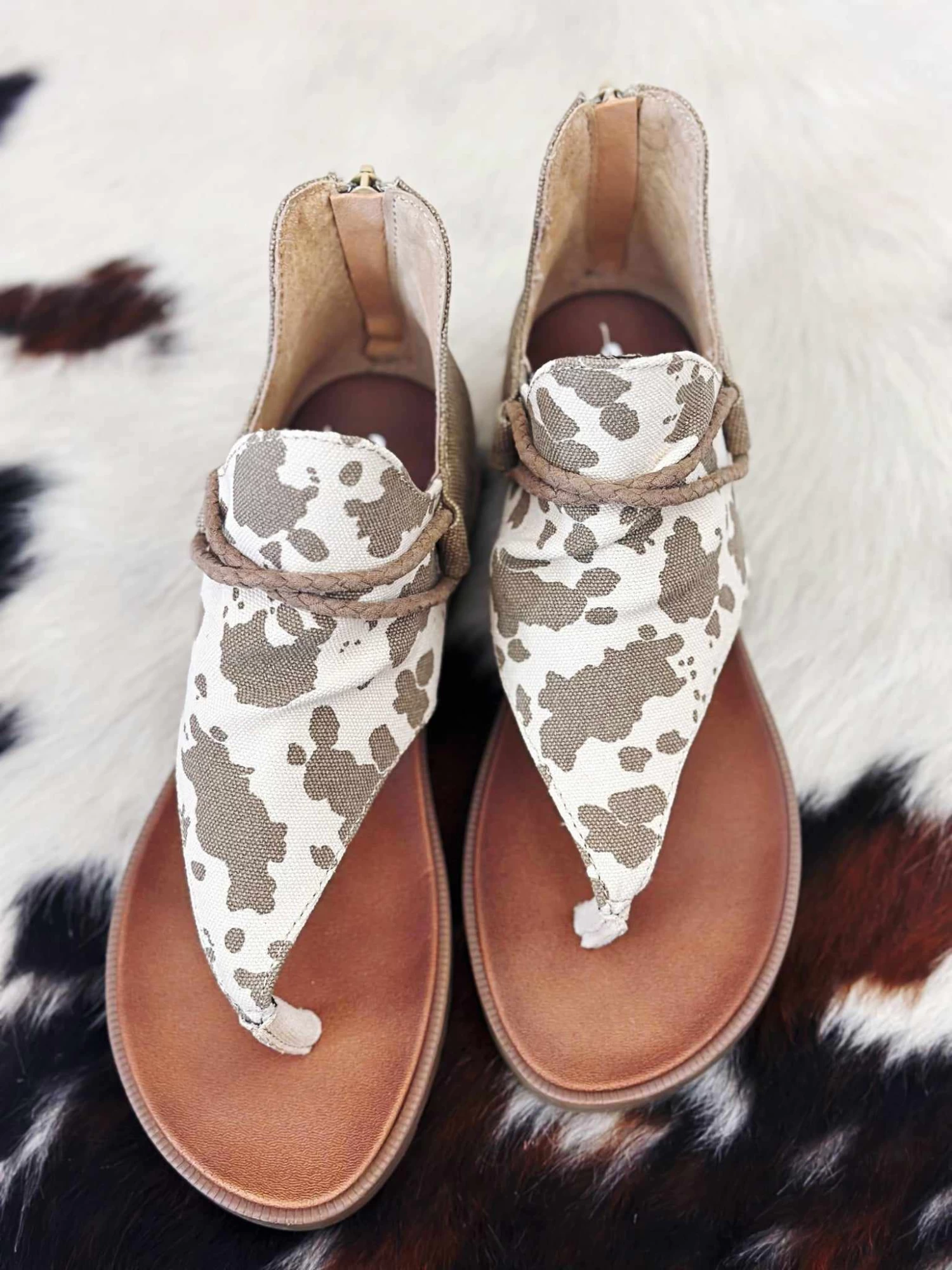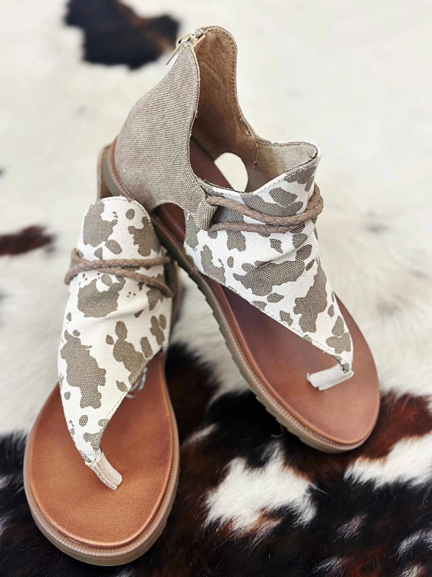 Rock the cow-chic look with the Angelika Sandal! This trendy thong-style sandal with a zipper-back promises to be the must-have of the summer. Not to mention, the burlap-y material keeps it comfy enough to moooo-ve along!