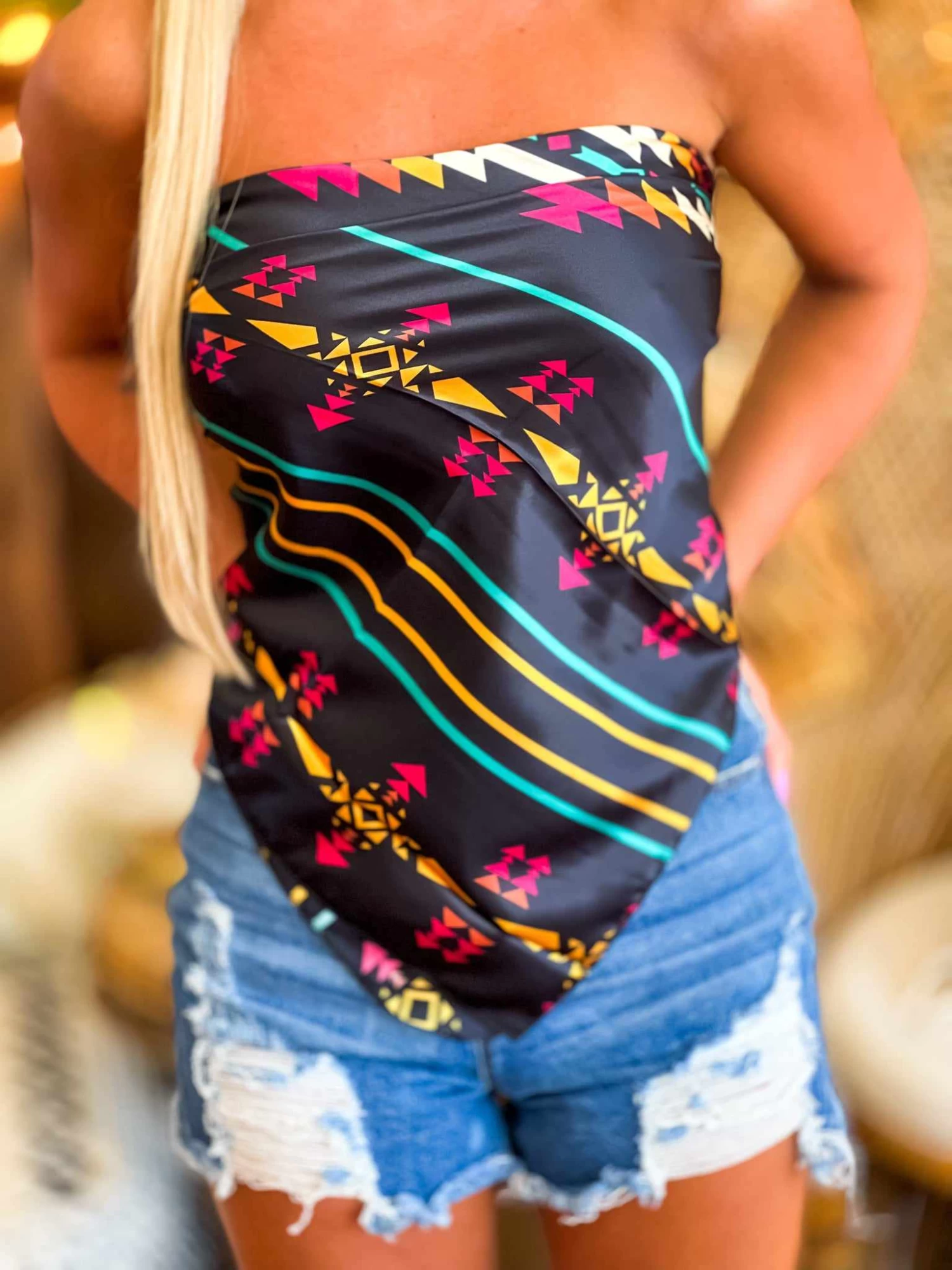 One silk scarf – dozens of ways to style! Wear the apache aztec print silk wild rag as a around your neck or as handkerchief top, bandeau, or bandana! The possibilities are endless! These silk scarfs will be the most versatile piece in your closet!