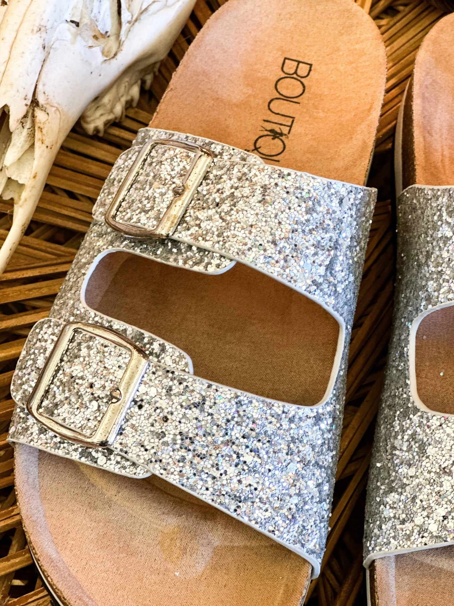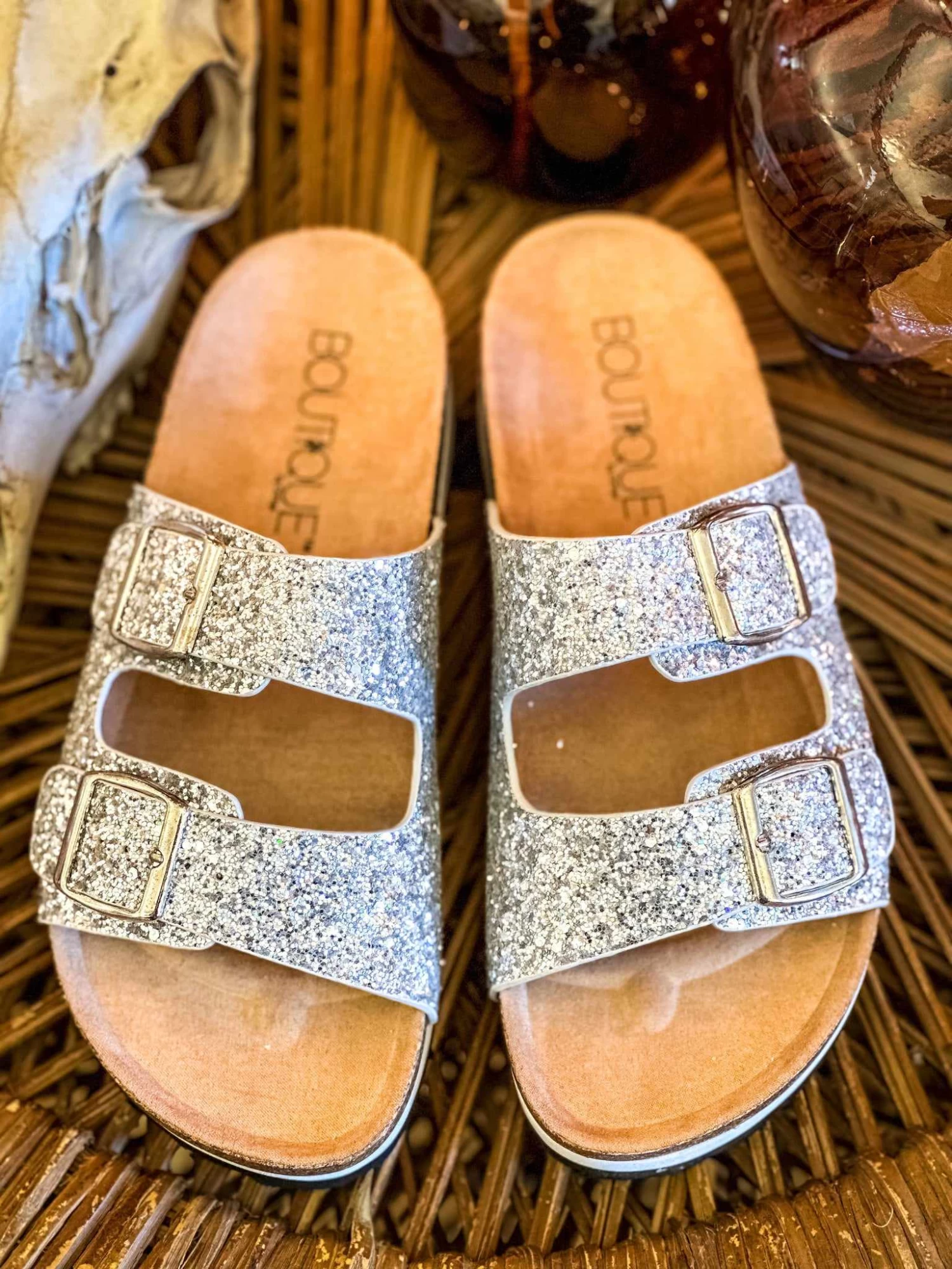 So comfortable and cute! The silver glitter double buckle sandal slides will be your go to this spring and summer! Perfect for on the go to run errands or a trip to the beach or pool! Add a little sparkle to all of your casual outfits!
