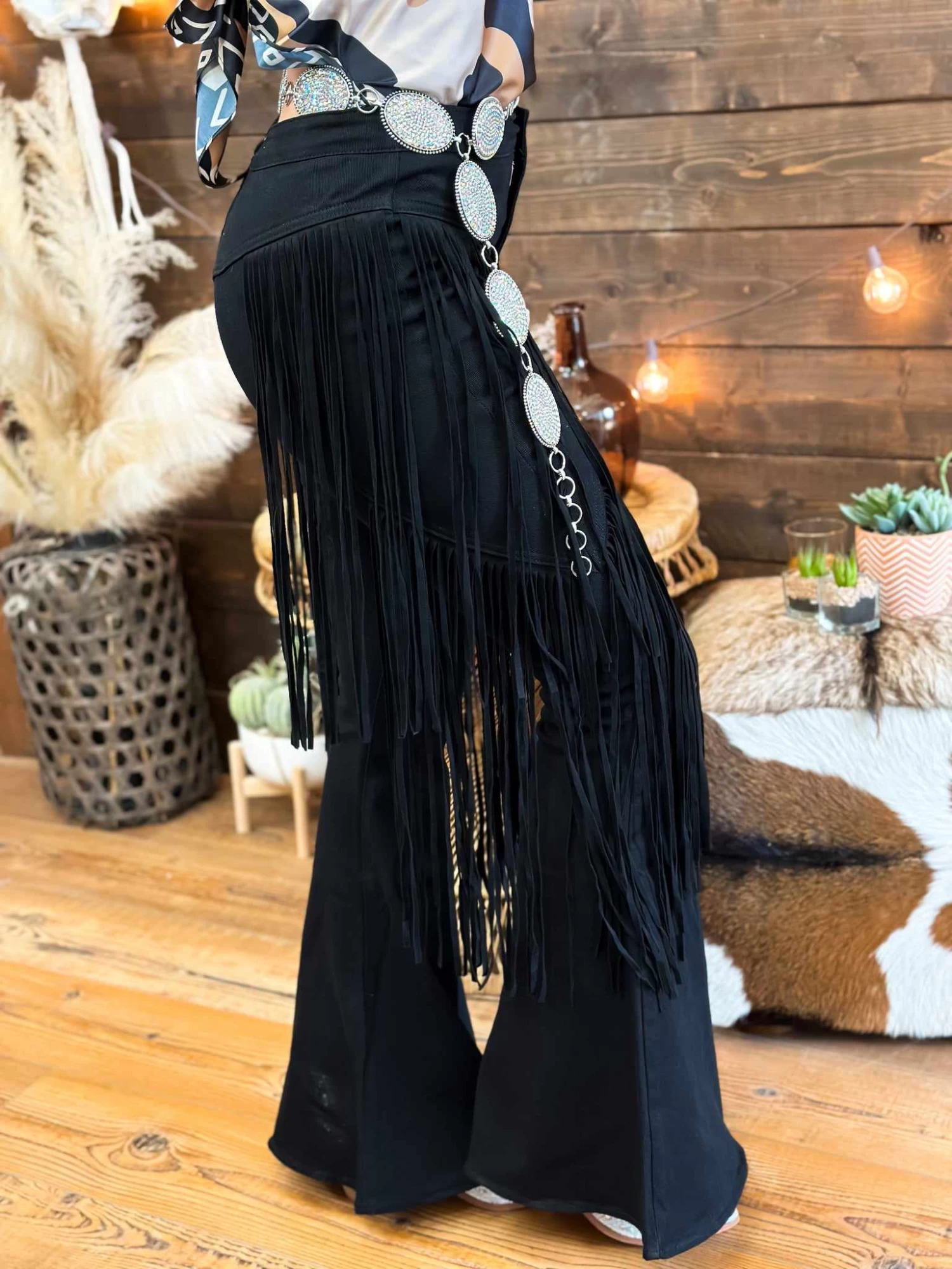 These western style black denim bell bottoms are a must have for the chics who love their fringe! These pants feature fringe on the sides that sway and swing while you are making your way downtown! The Black “Frisky Fringe” Bells are a must!