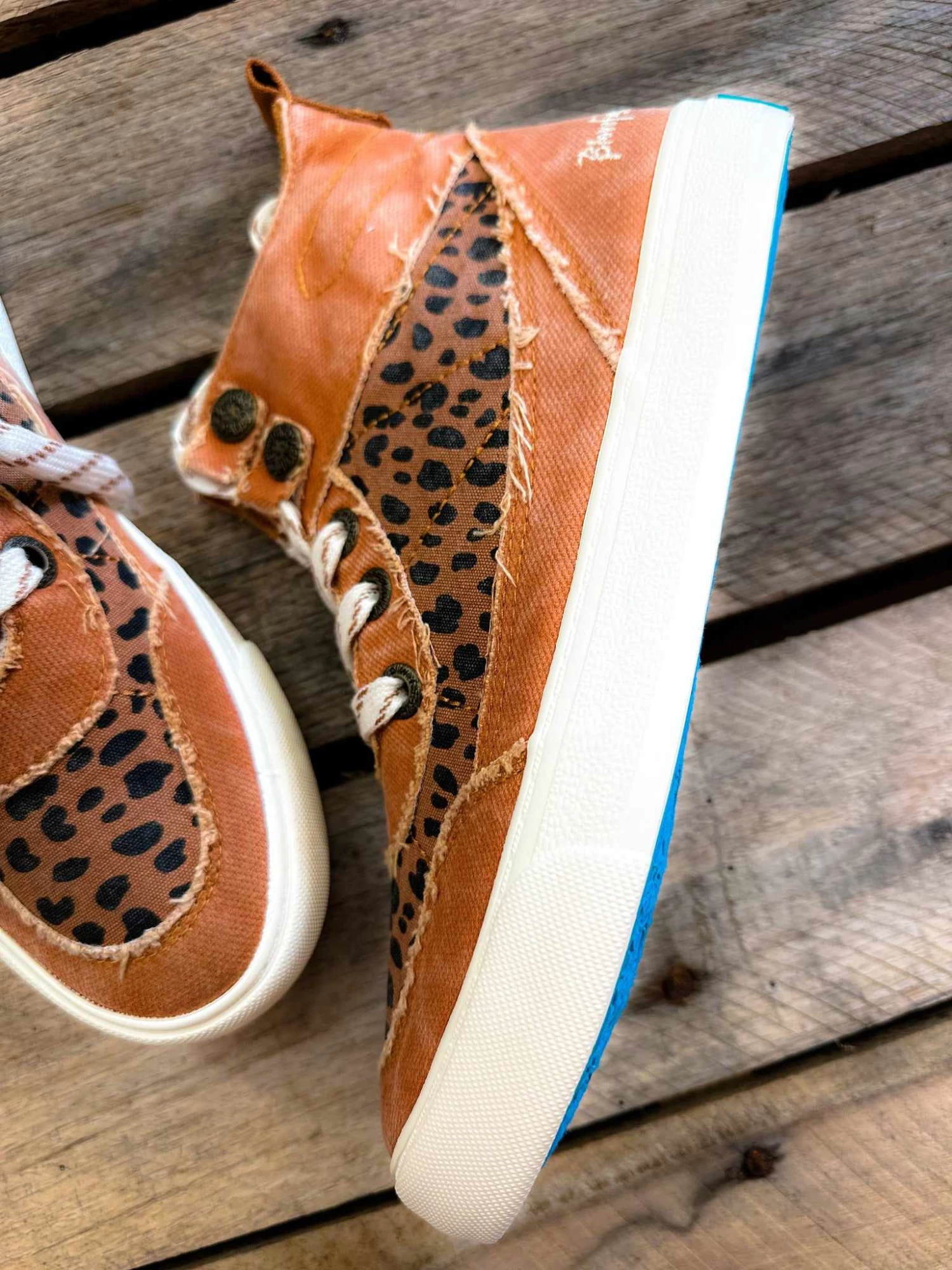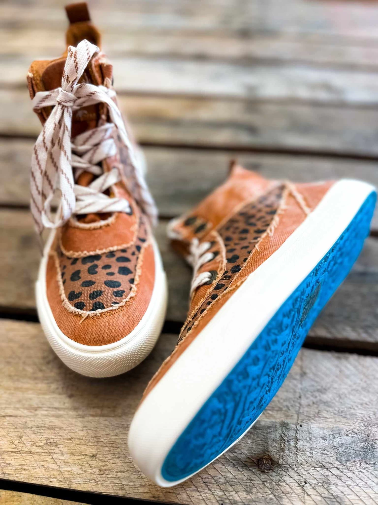 The sneaker you want! Pops of leopard and blue bottoms. These are so much fun! Pair them with your graphic tees or dress down your favorite staple top! These sneakers are great for year round!Â