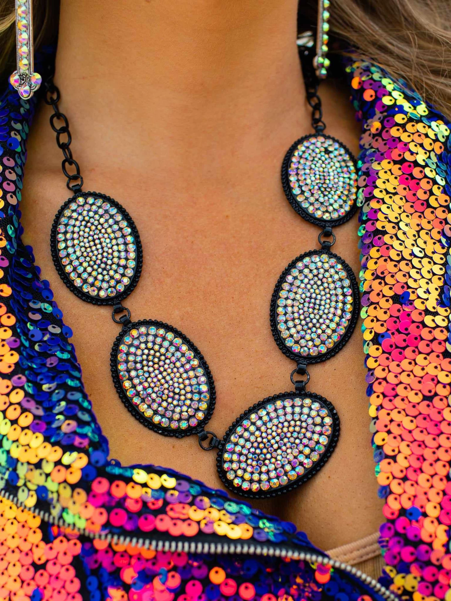 This chunky metal statement necklace has serious rocker chic vibes! Featuring matte black metal and large oval pendants filled with iridescent crystal beads, this necklace is a must have for dresses and t-shirt alike!