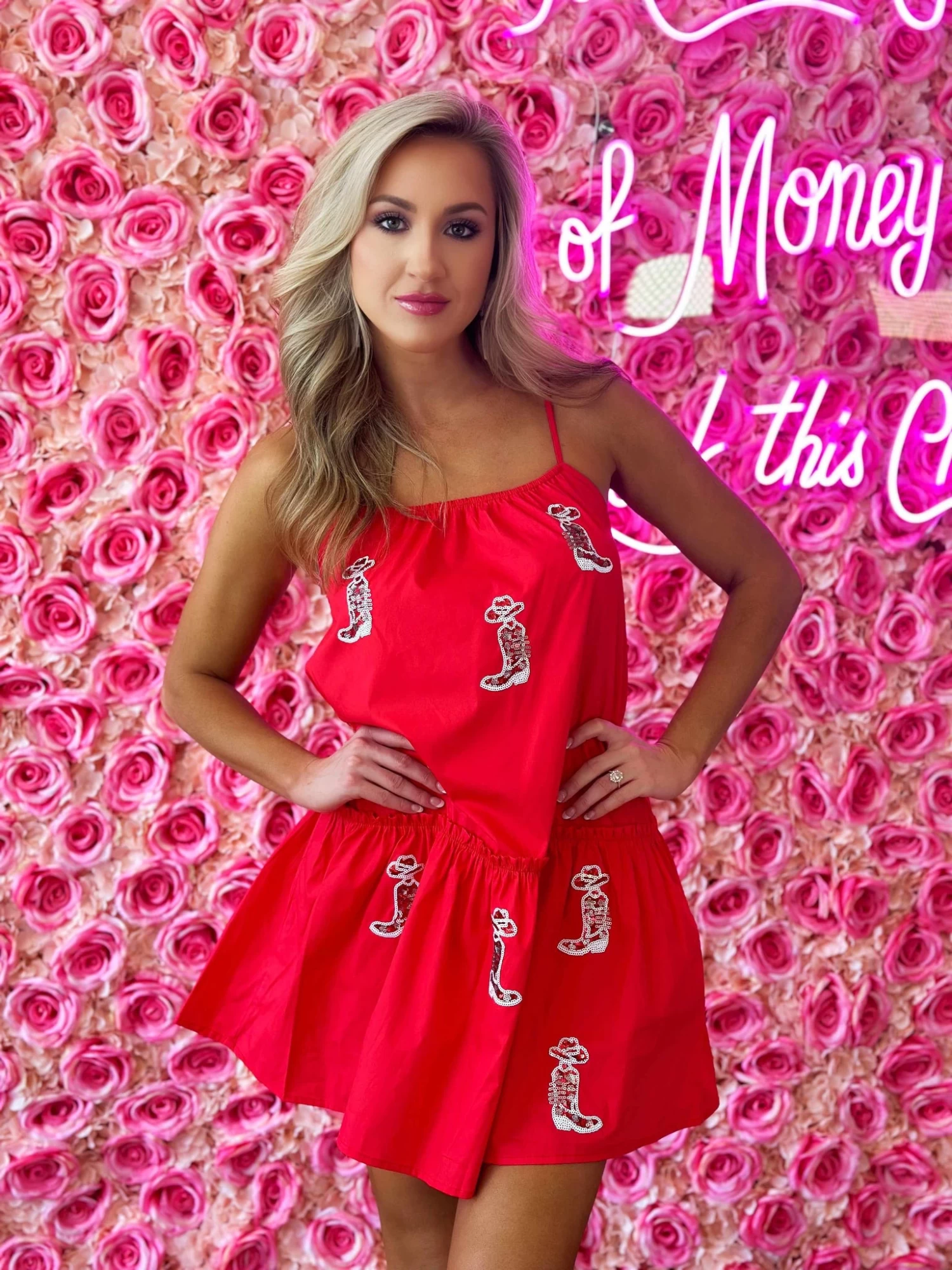 Wow! It’s true what they say: Red is the color of summer lovin’! This Boot Scootin Into Summer Dress is the perfect pick for a day of makin’ memories; the vibrant red color is sure to turn heads, while the sequin-embroidered boots add a fun, sassy touch. Plus, it’s cute, comfy, and totally ready for an adventure – yeehaw!