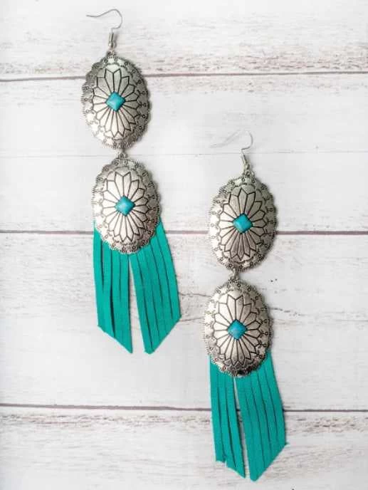 You can never have too many fringe earrings! These beauties feature a double silver oval pendants turquoise stones finished off with beautiful turquoise fringe!