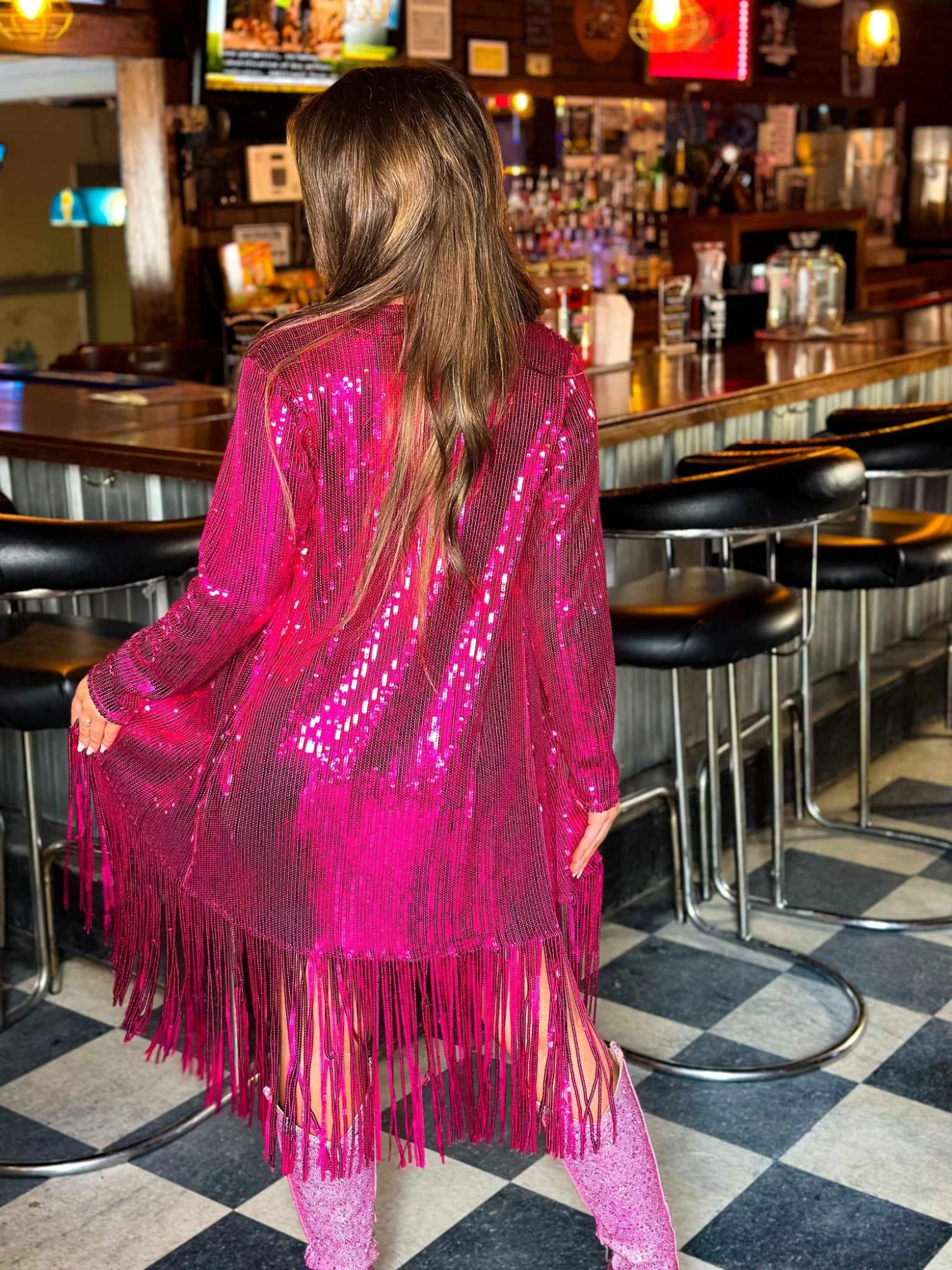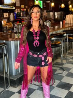 Handmade, this duster is absolutely AMAZING! Great for special occasions, dates, or concerts, this Southern Fried Chics Duster is a MUST HAVE! It’s long sleeve, has a complimentary fit, and is sure to have you sparkle and shining anywhere you go! This piece is a LIMITED EDITION! Pair this duster with your favorite tops and bottoms or dresses for a sassy look!