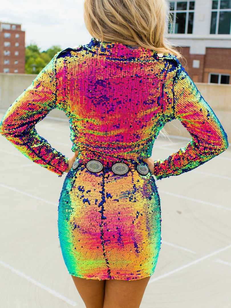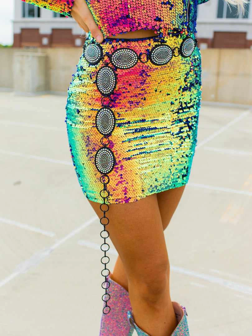 This luxe premium sequin mini skirt is a shimmering multi color show stopper! Featuring high quality premium sequins in a dazzling array of pinks, gold, blues and greens that is positively cosmic. This skirt is the life of the party, and the party don’t start till you walk in!