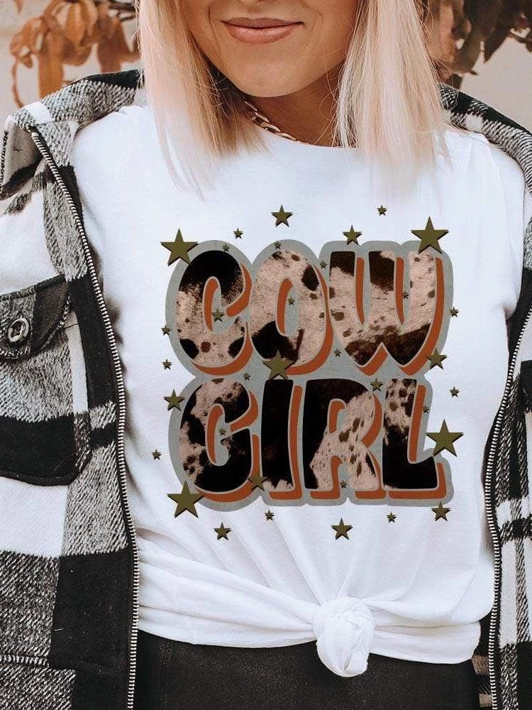 We love this “western vibe” tee. Cowgirl with a little cow print and the stars add the final touch! This tee is perfect for layering. Easily dressed up or dressed down! Printed on a unisex super-soft tee. White.