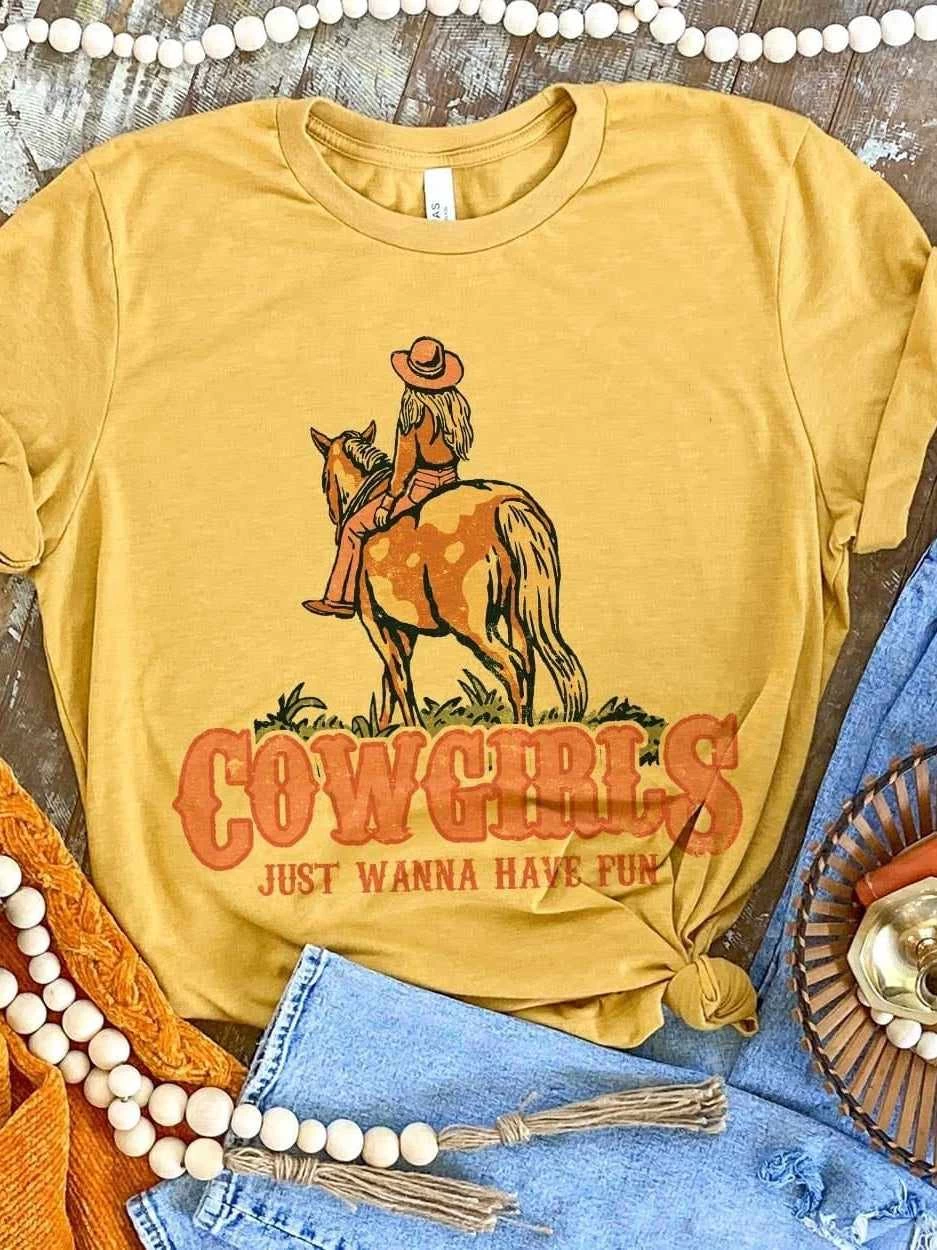 We can’t keep away from these tees! They give off the perfect western vibe! This tee is for cowgirls who just wanna have fun! This tee is perfect for layering. Easily dressed up or dressed down! Printed on a unisex super-soft tee. Mustard colored Tee. Also available in cream and mauve.