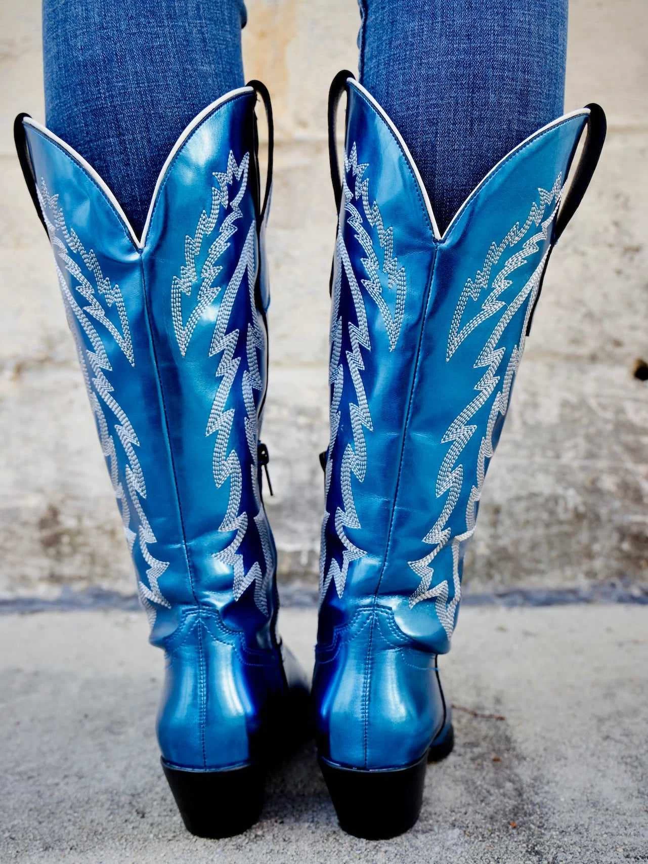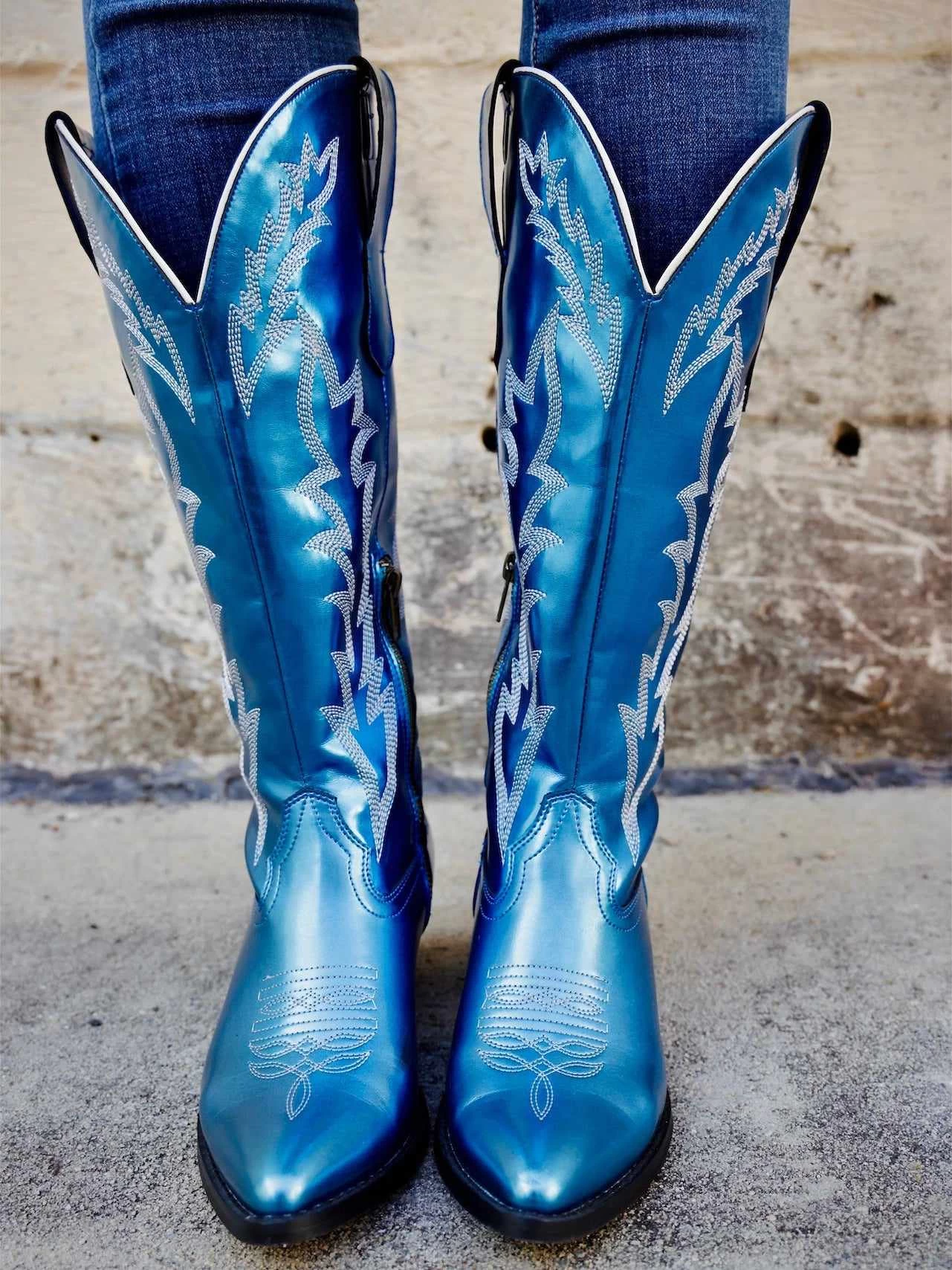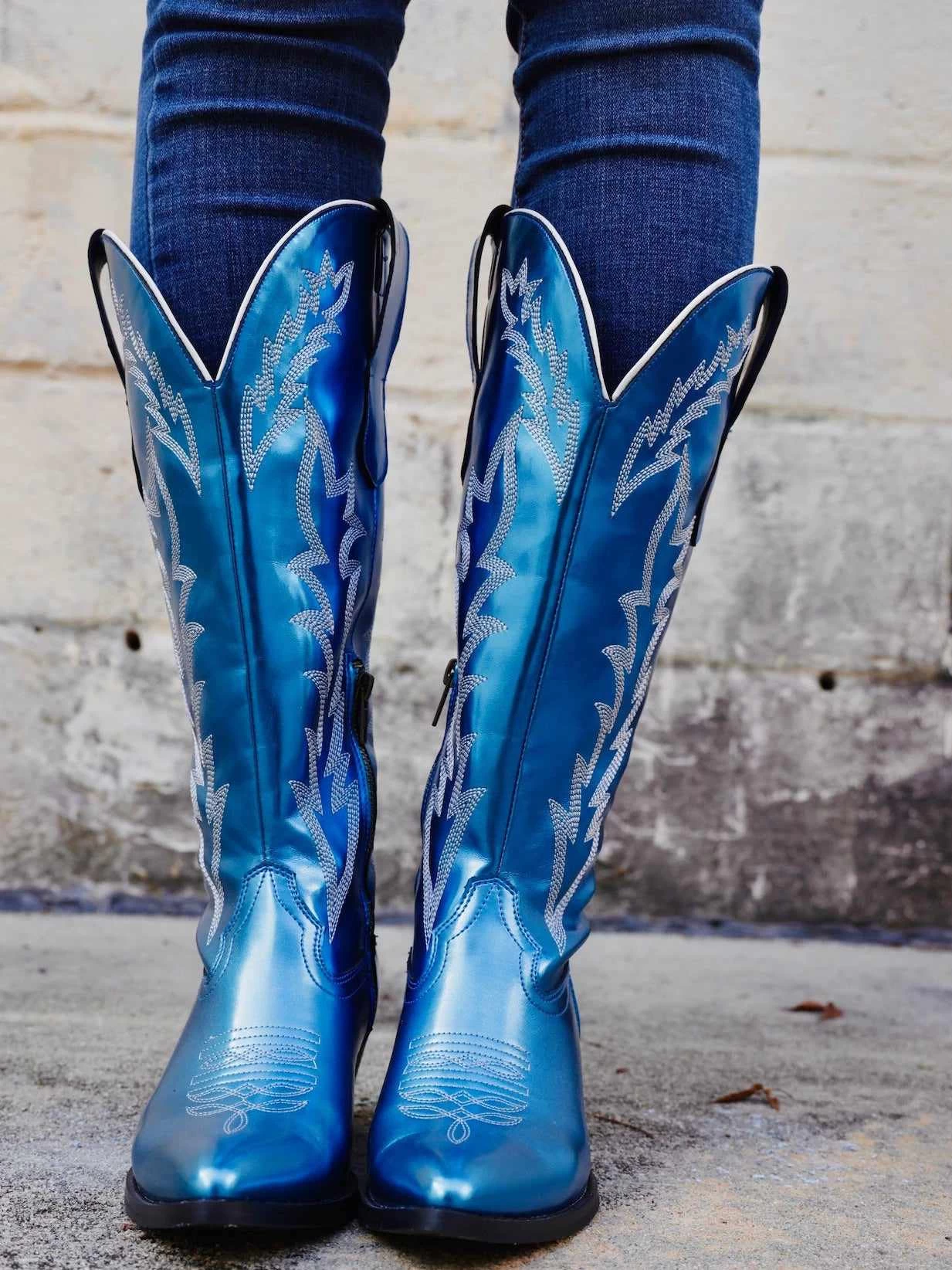 Dreamy Iridescent blue cowgirl boots, perfect for strutting’ your stuff in your favorite pair of jeans. Equally great as wedding boots – these beauties can be your something blue! Featuring embroidered detail, pointed toes and a sassy heel for maximum strutting. These cowgirl boots have a slight iridescent shine, making them perfect dressy boot for your party dress or a country concert!