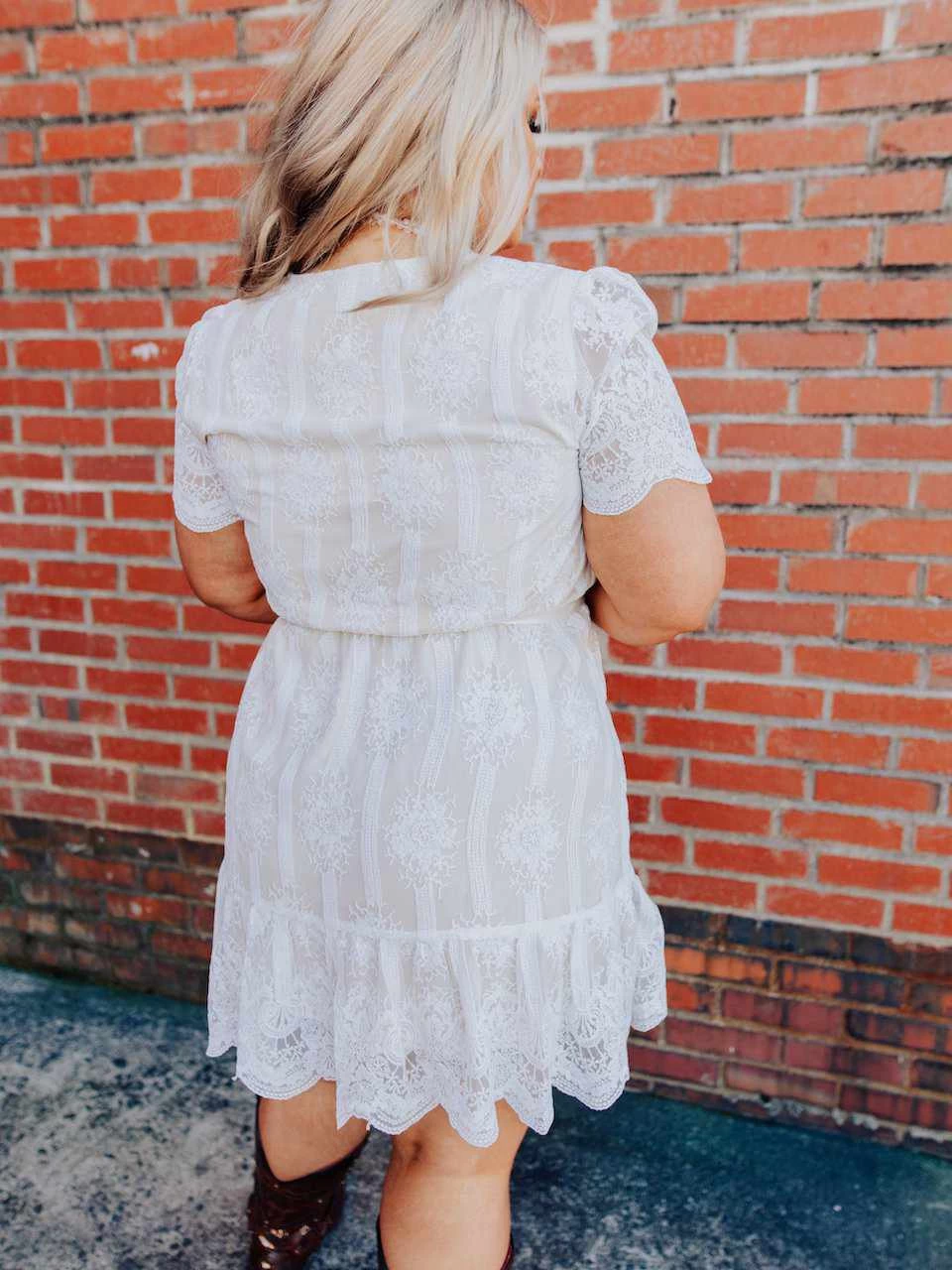 Where dainty meets fun. The Feeling Flirty dress features short sleeves, a floral lace applique overlay, and a satin ribbon belt that adds the perfect feminine touch.Â
