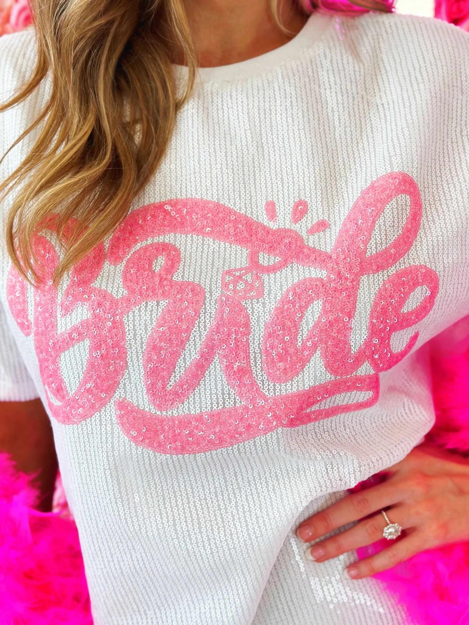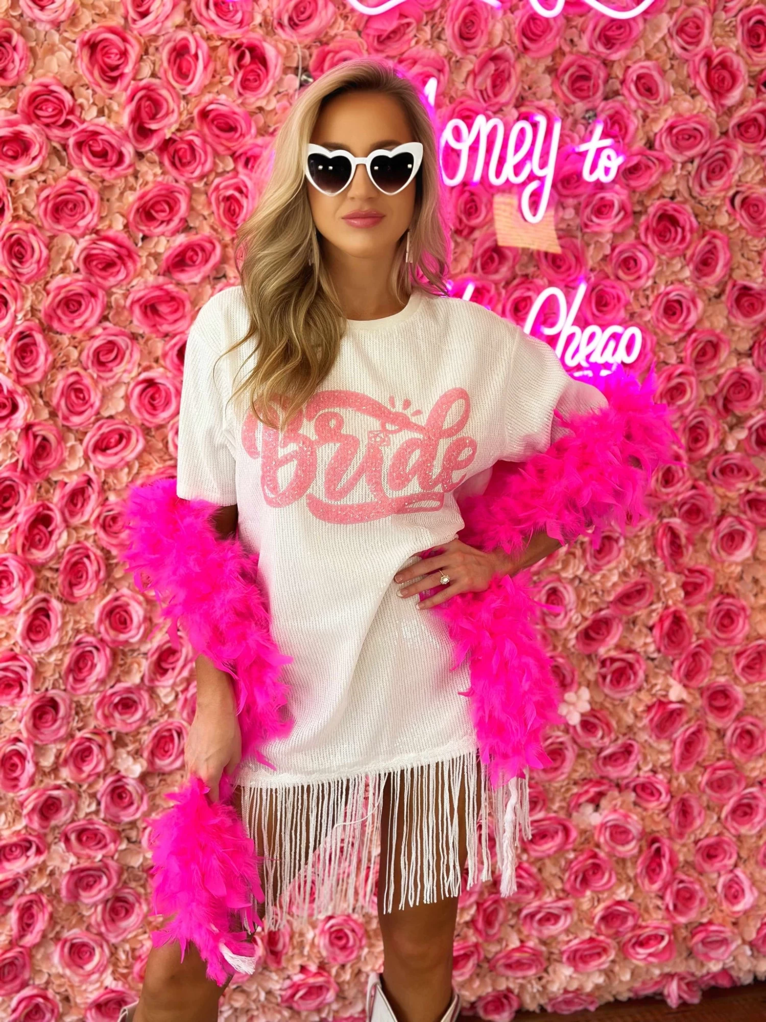 Glow bright in this Getting Real Sequin Bride Dress! This white t-shirt dress is ready for bachelorette or wedding celebrations, with its fringe hem and the word “Bride” in pink sequins across the front. Who said dressing up can’t be fun? Get ready to ROCK this one-of-a-kind dress!