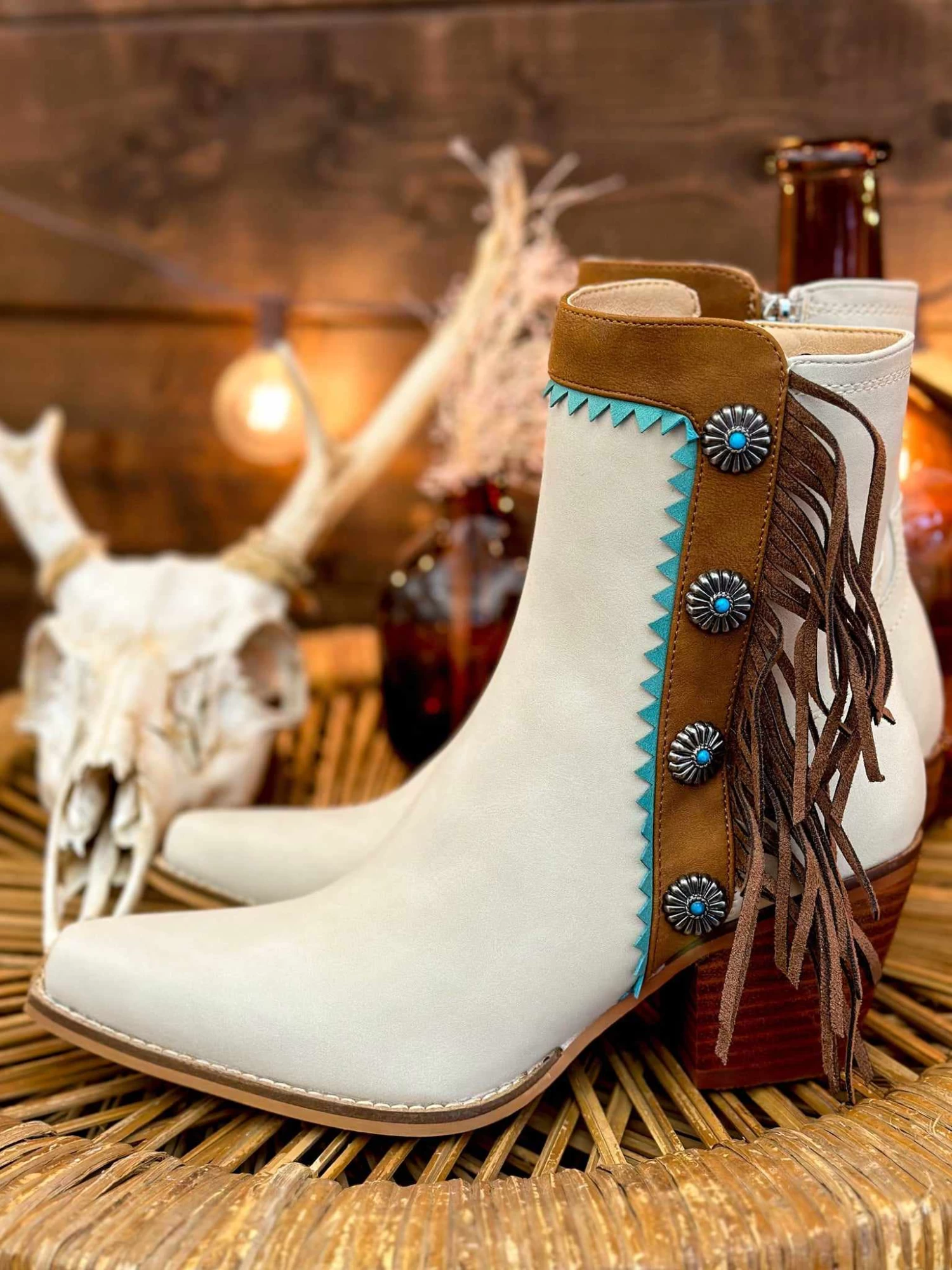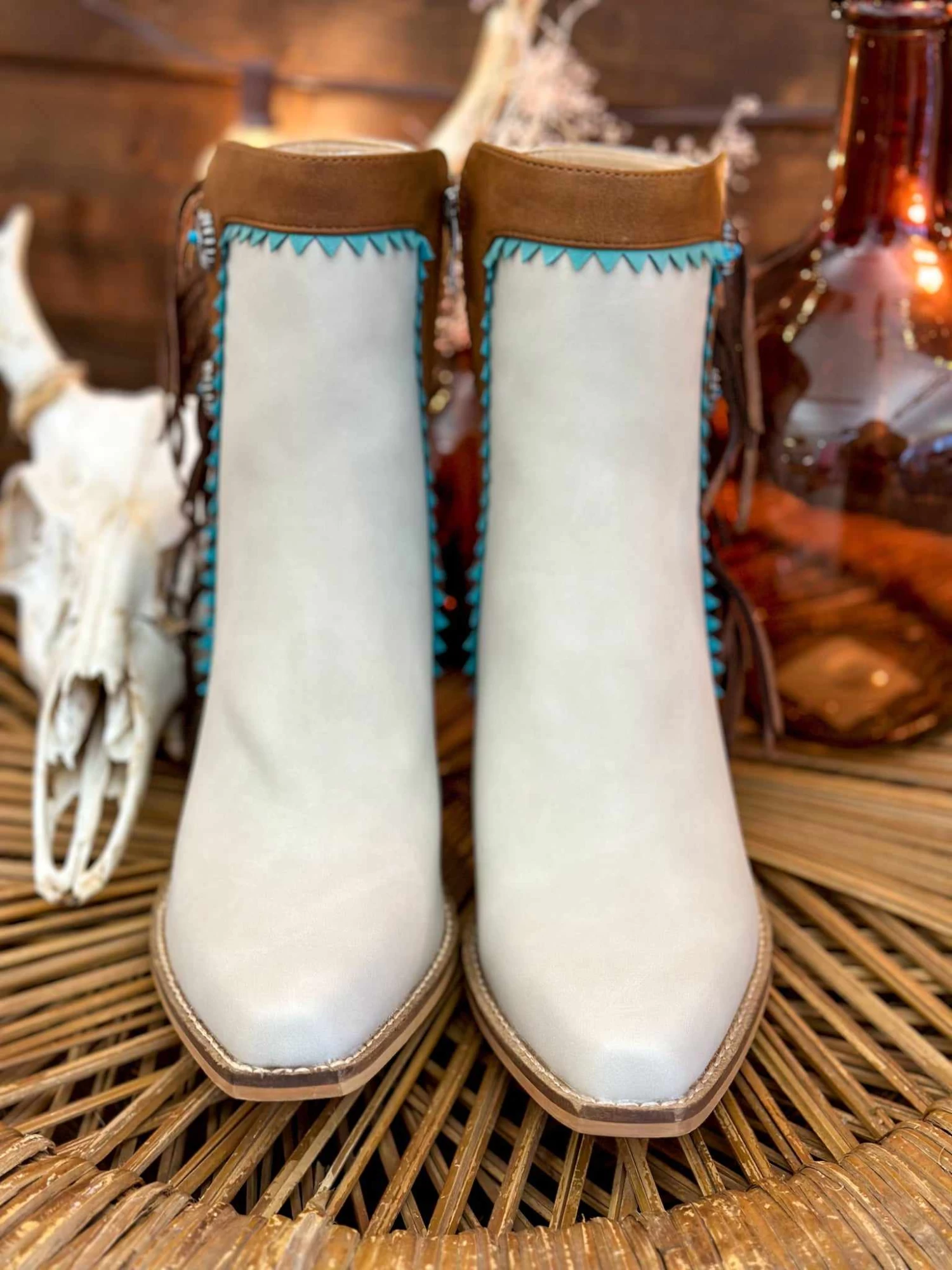 Beige and Turquoise Fringe Booties