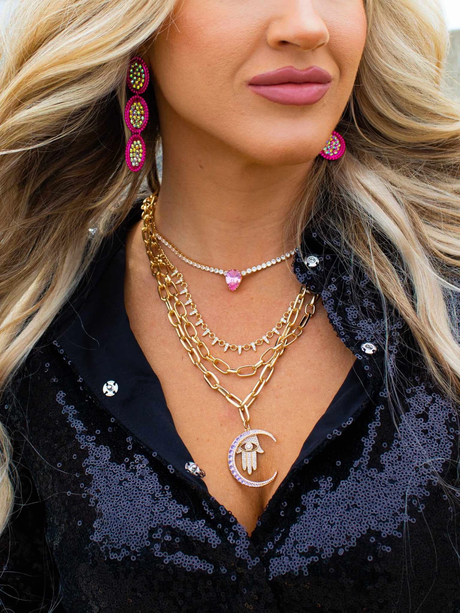Boho pink crystal crescent moon pendant on a chunky gold chain with beautiful hamsa evil eye charm. The Hamsa evil eye is a symbol of peace and provides the wearer with protection from negative vibes.