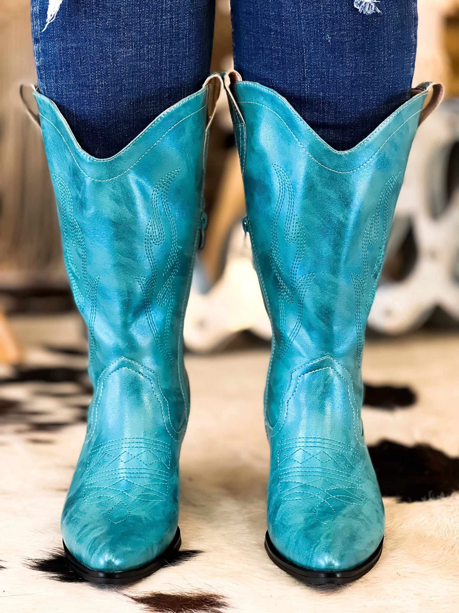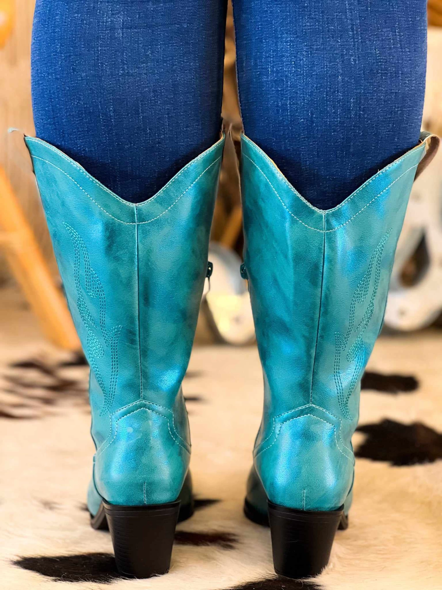 Nothing will put a spring in your step like these one of a kind metallic blue boots! These western boots are mid calf and feature a pointed toe, extra wide calf and a lustrous metallic blue finish!Â