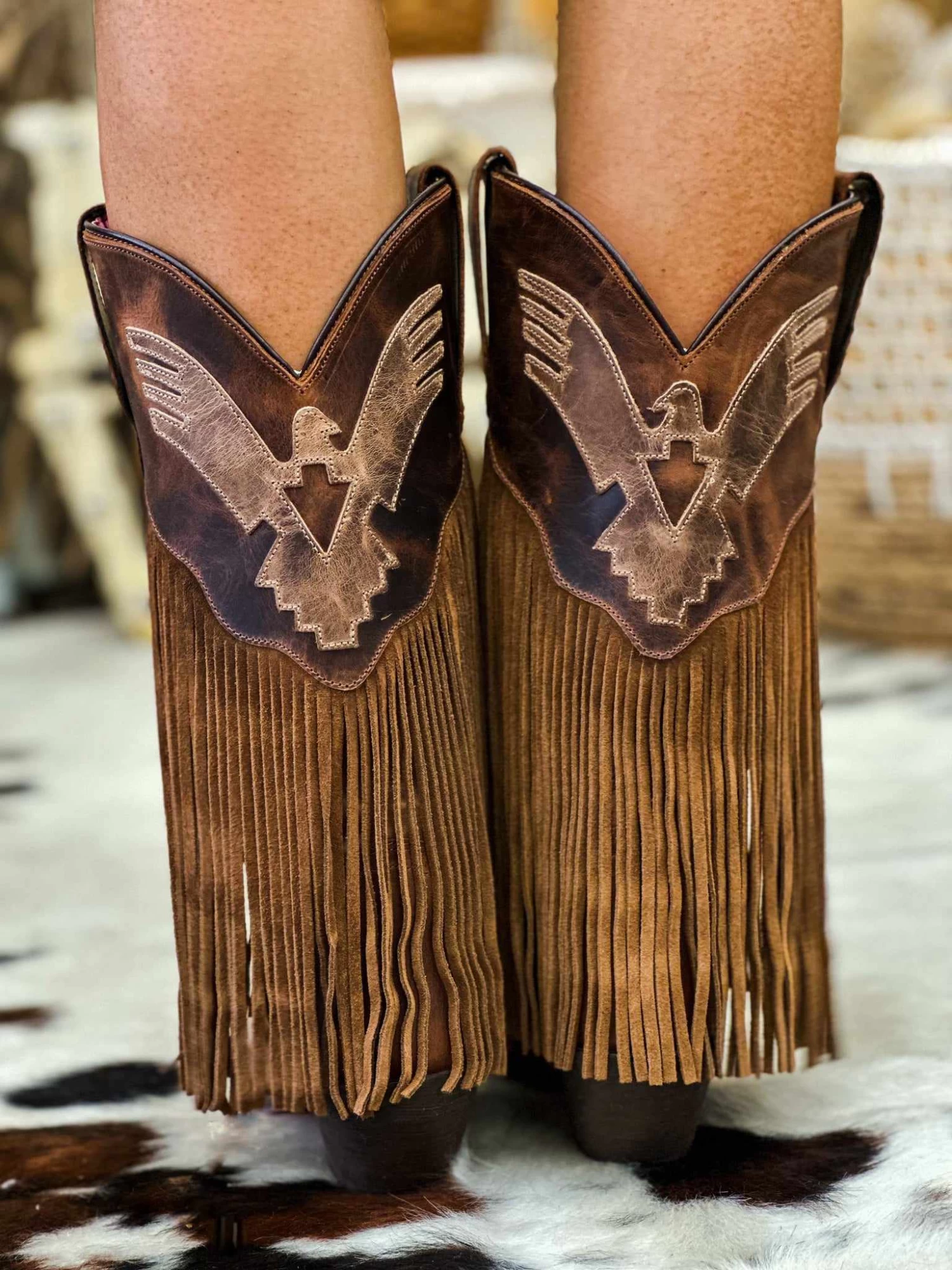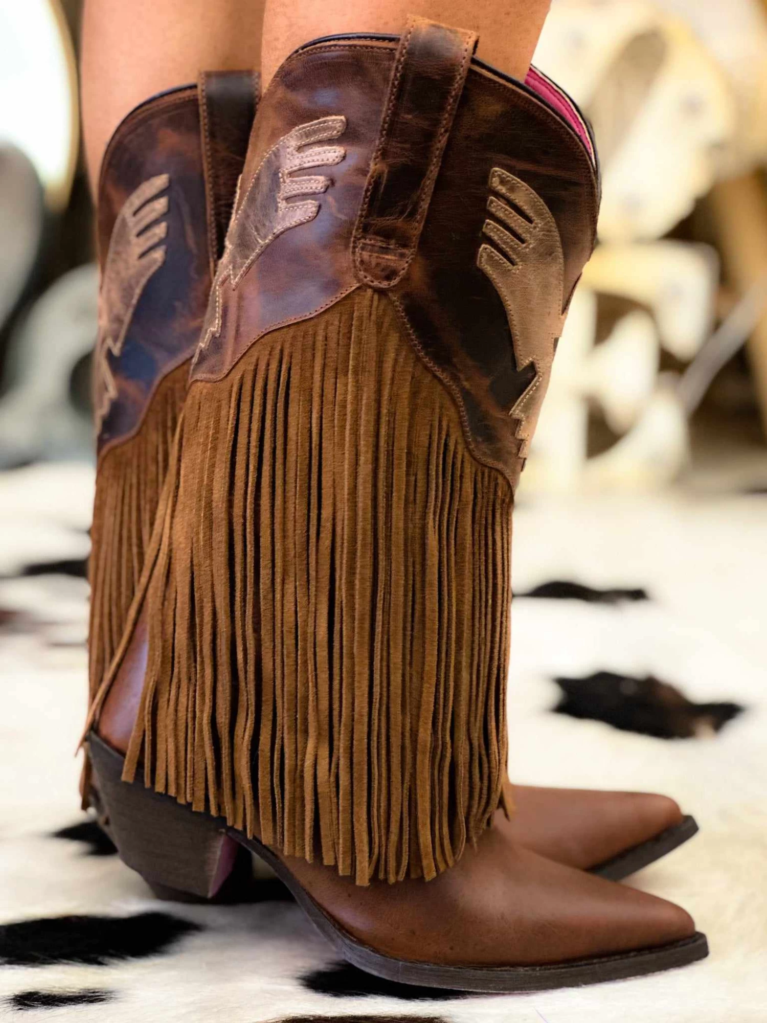 Wowza! Our “Hit The Road” Thunderbird Fringe Western Boot is calling your name! Great to show off at your next shin-dig! Style with one of our dresses or cut off jean shorts for a Southern Fried look. Pink leather lining with painted pink bottoms.Â