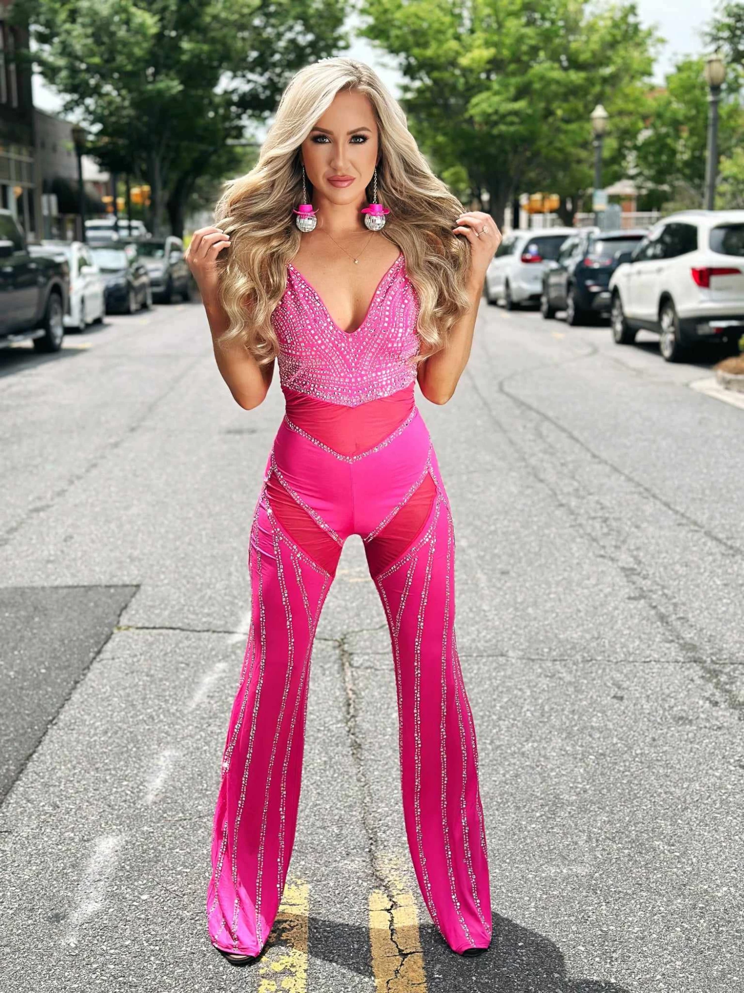 I see you lookin! Wow! This jumpsuit is a stunner! This pink color rhinestones and stud jumpsuit is HOT HOT HOT! This jumpsuit features premium studs and rhinestones that sparkle with every strut you make! In a form fitting jumpsuit style that lays perfectly on your body, see through mesh center and zipper back, this will become your new favorite party jumpsuit! You will turn heads in this smokeshow!