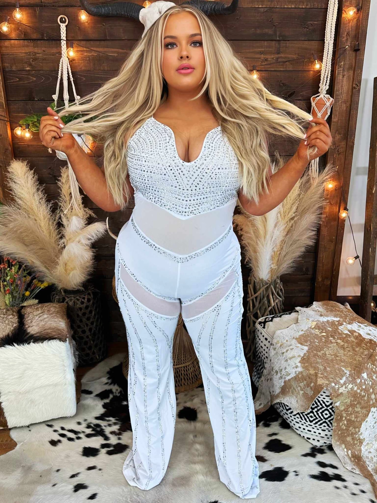 I see you lookin! Wow! This jumpsuit is a stunner! This white color rhinestones and stud jumpsuit is HOT HOT HOT! This jumpsuit features premium studs and rhinestones that sparkle with every strut you make! In a form fitting jumpsuit style that lays perfectly on your body, see through mesh center and zipper back, this will become your new favorite party jumpsuit! You will turn heads in this smokeshow!