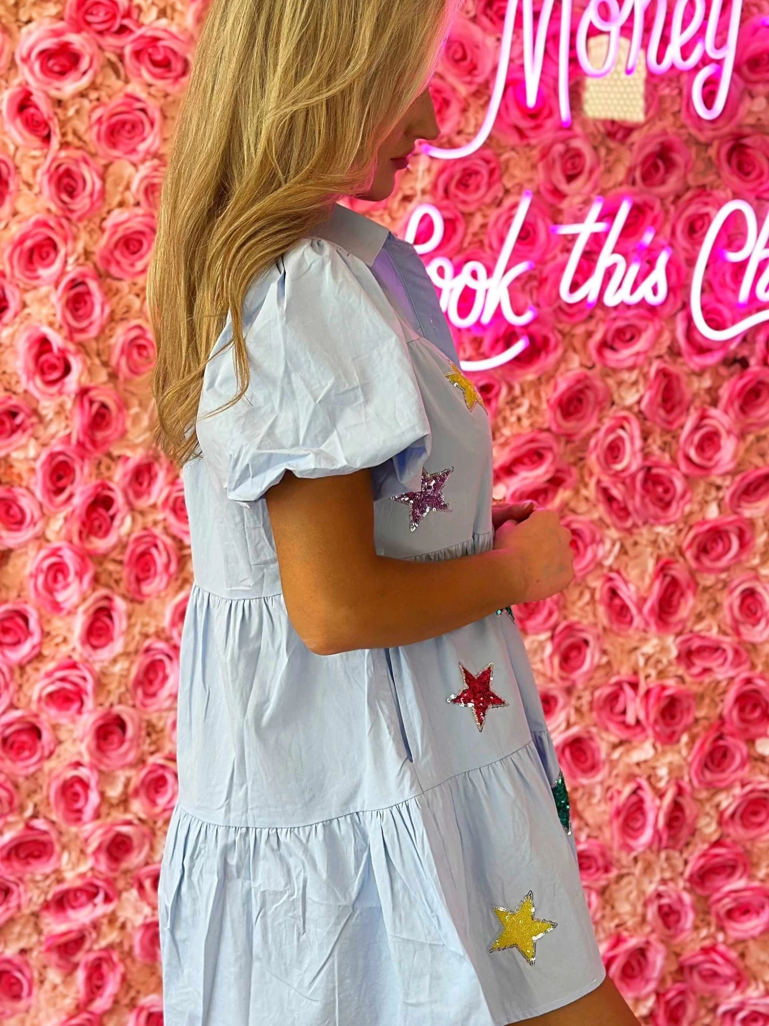 It’s your time to shine in the Keeper Of The Stars Dress! Our baby blue short sleeve puff sleeve dress makes it easy to show your stardom – the multi colored stars will sparkle and add extra star power to any party! Perfect for fun summer days, this dress is sure to make you the star of the show!