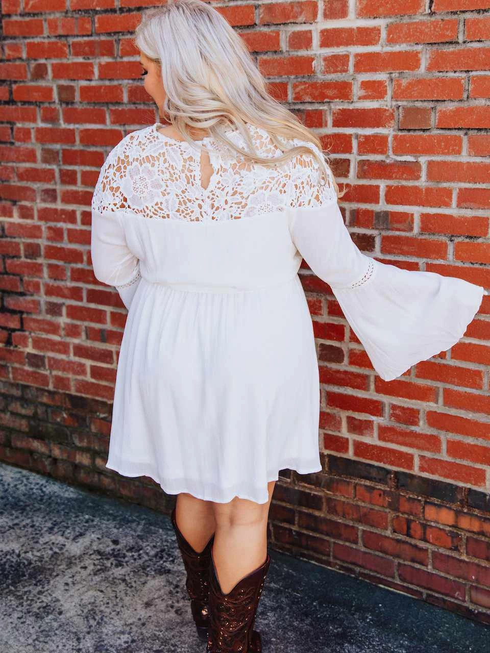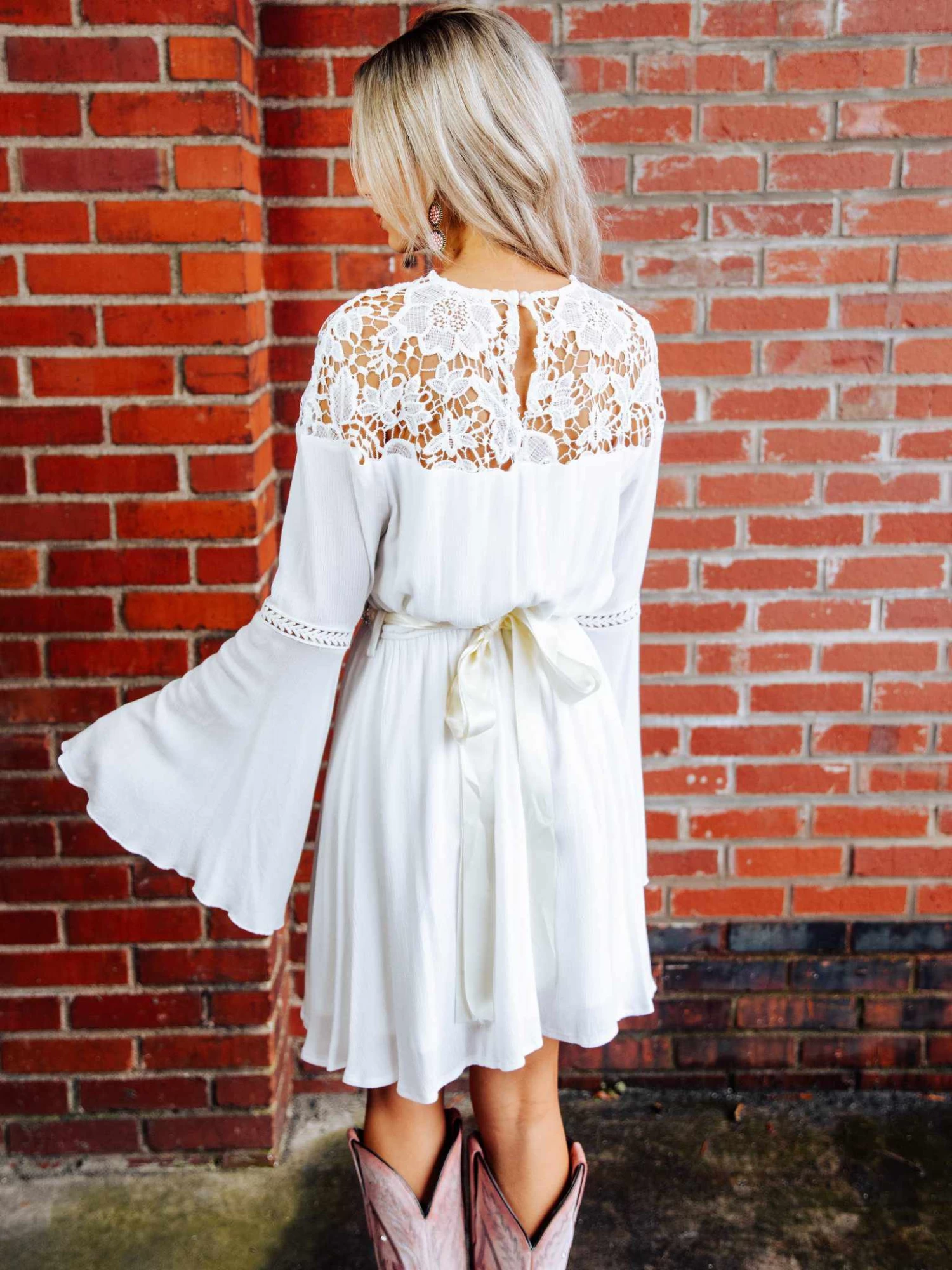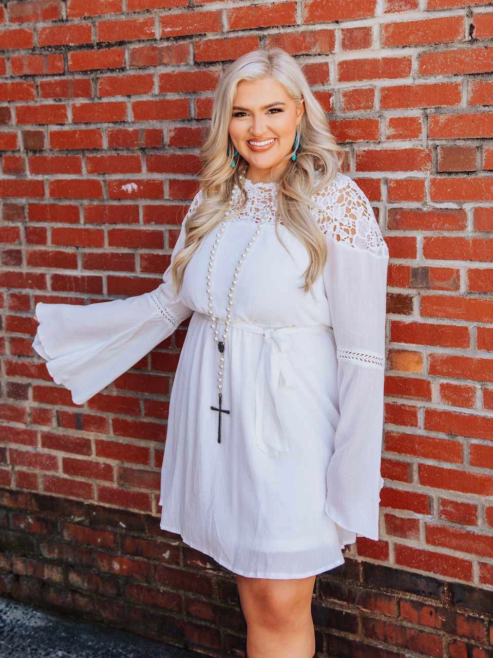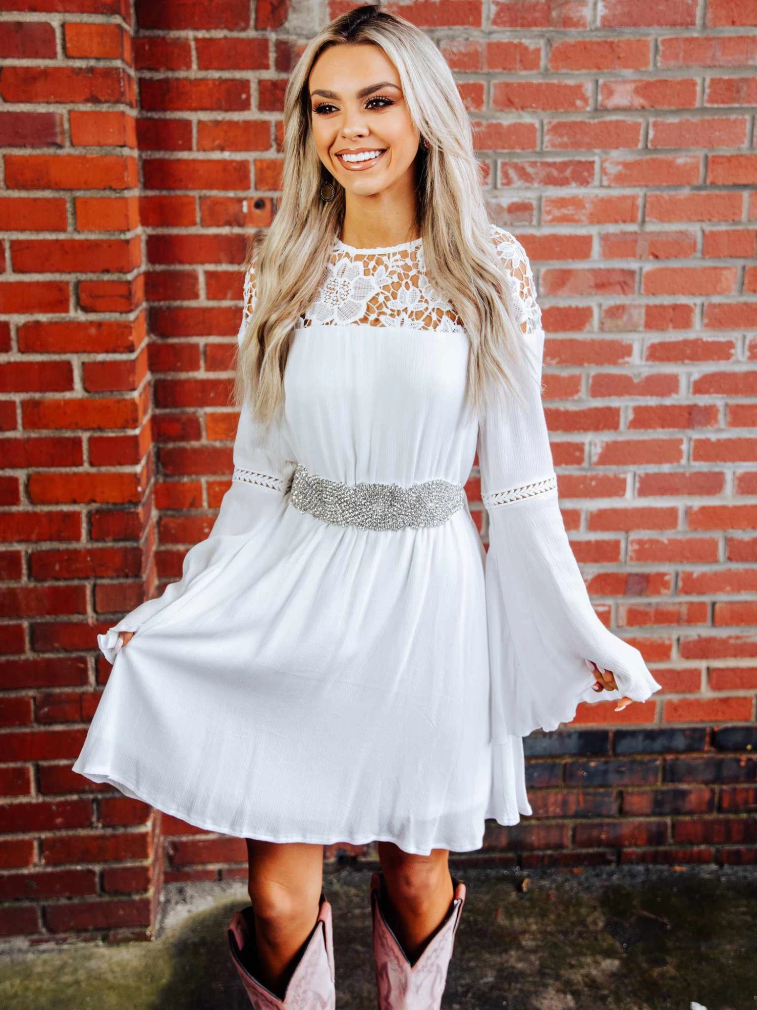 With long sleeves and beautiful lace applique, the Lily Grace dress is a must-have for spring and summer. Pair it with the Rhinestone Crowning Moment belt for an ultra-glam look.Â