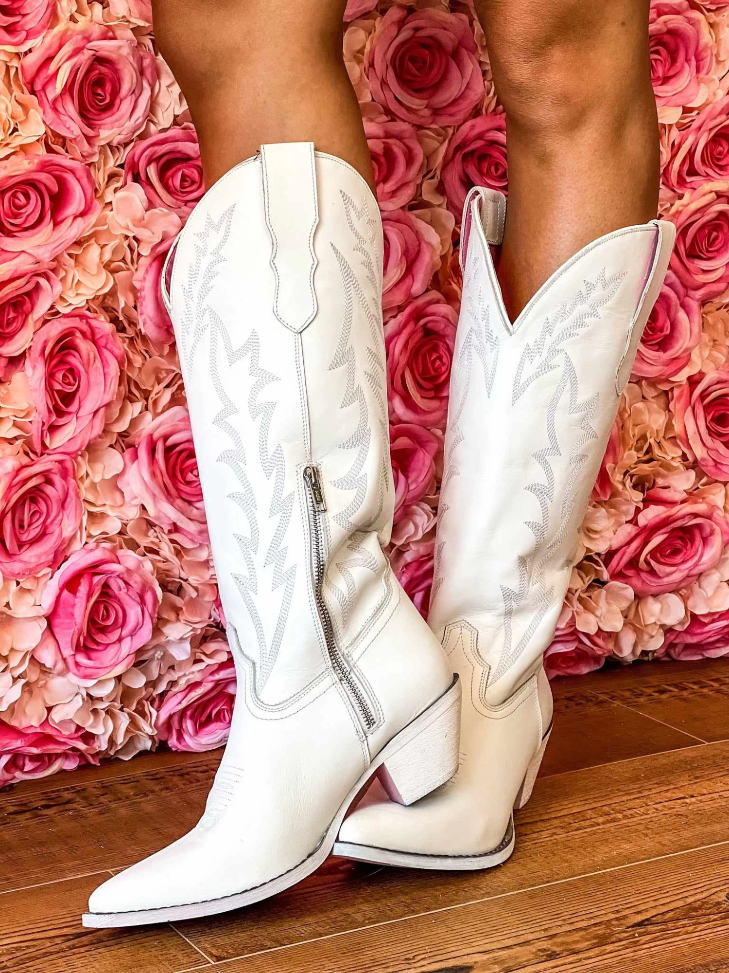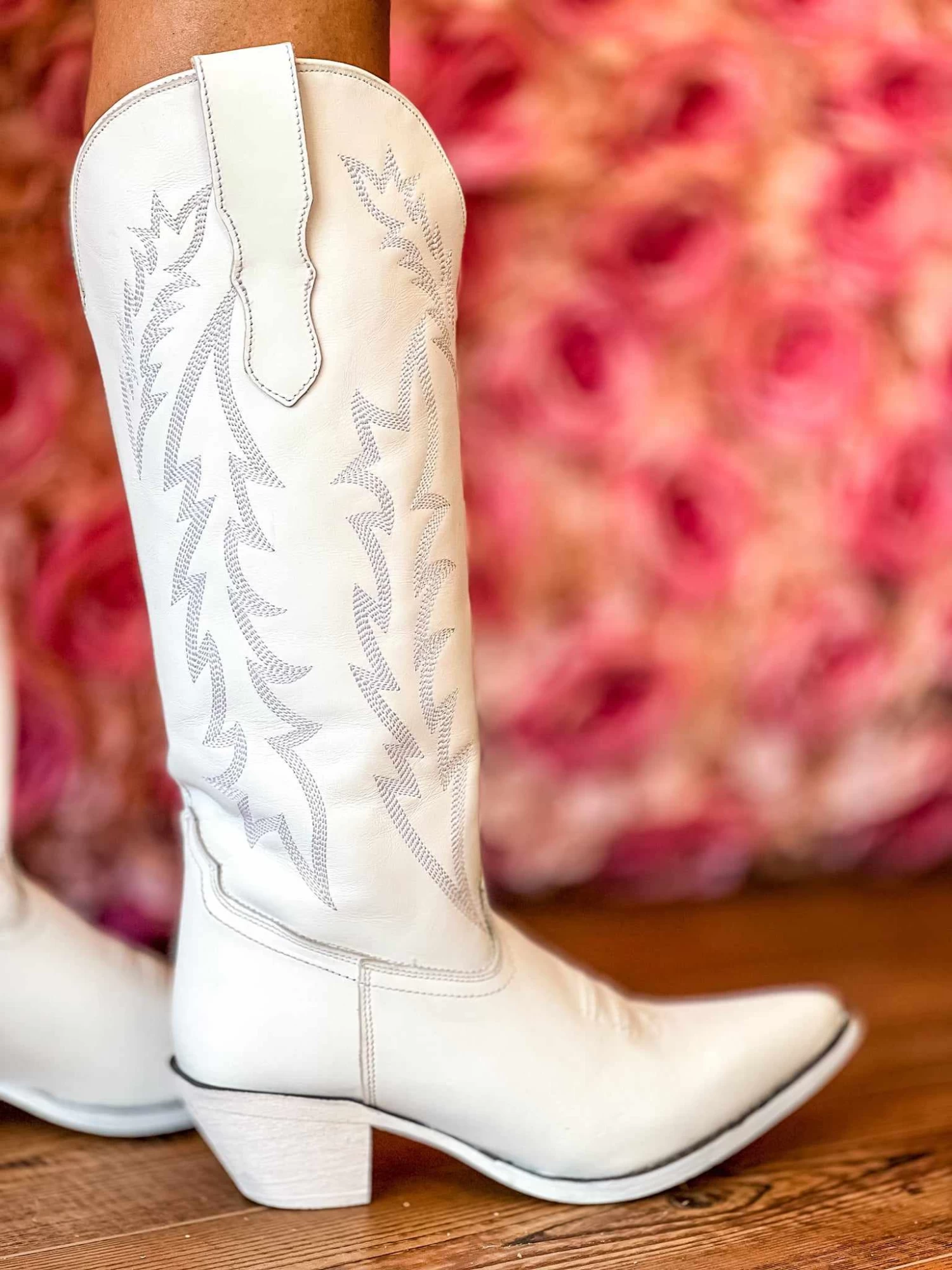 The Loretta Boot is a white leather western boot featuring a snip toe and off white stitching. Loretta has pink leather on the inside of the boot and pink painted bottoms.Â