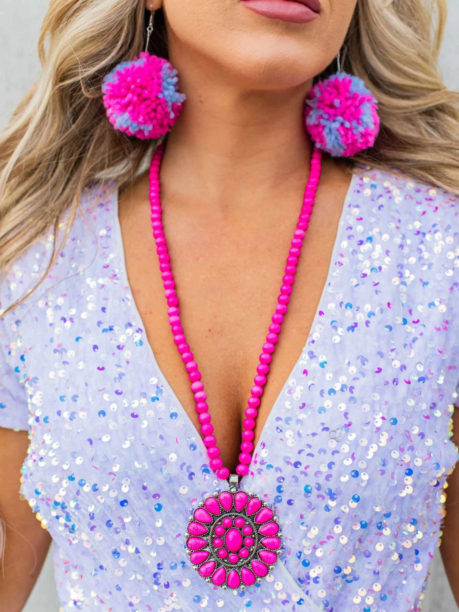 A girl can never have too many pink accessories, and this barbiecore pink necklace is a must have! Featuring a long beaded chain and a vintage style circle flower pendant made with marble pink stones in a gunmetal setting.