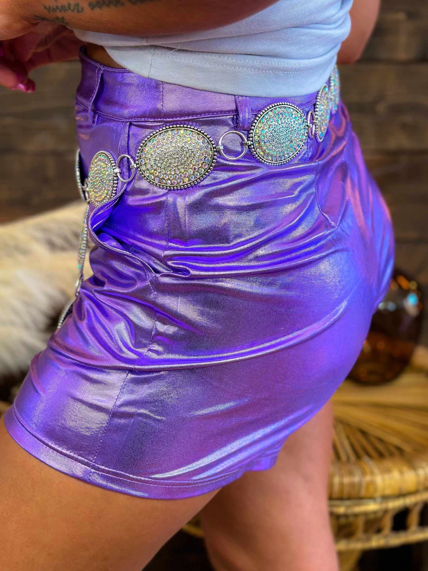 Rock out all summer in your PU leather purple shorts! Featuring a front pockets and a faux leather look, these purple shorts are perfect for creating a rocker chic look! Unique metallic shorts for those who were born to stand out!