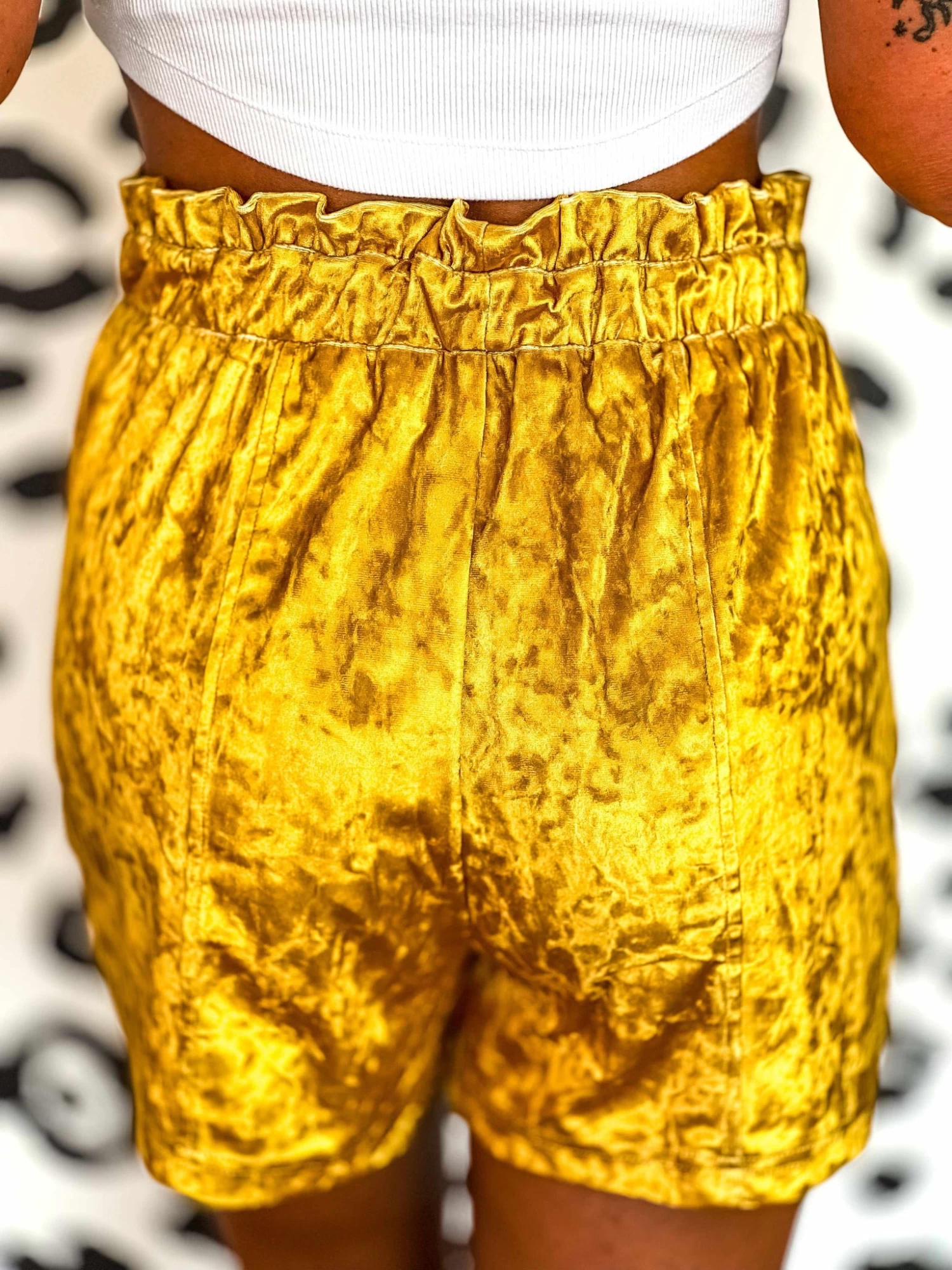 Stay comfy in the Vetiver Velvet Shorts. Perfect for a day out with your girls! These are going to be your casual shorts, but always staying in style! We love the ruffle feature. And, not to mention, these shorts have pockets! Easily dressed up or dressed down! True to size fit. Elastic waistband and stretchy material.Â