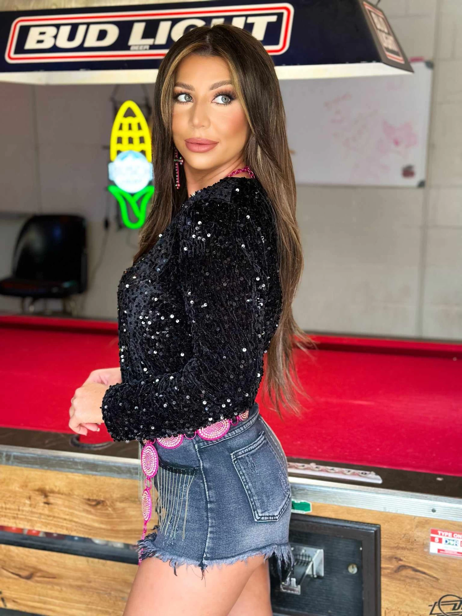 This black sequin bodysuit has a loose flowy fit that’s super flattering for every body type! With a faux wrap v-neck, loose long sleeves and a roomy waist, this sequin bodysuit will be your go-to for parties, date night or girls night out!