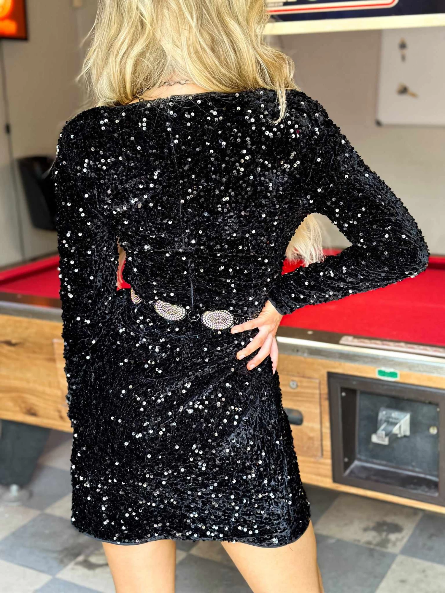 Long Sleeve Black Sequin Dress with Tulip Skirt