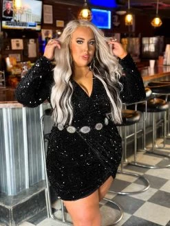 When you’re wearing this sexy black sequin cocktail dress, every hour is happy hour! Featuring a v-neck wrap top, long sleeves and a tulip style skirt, this black mini dress is the ultimate must have little black dress!
