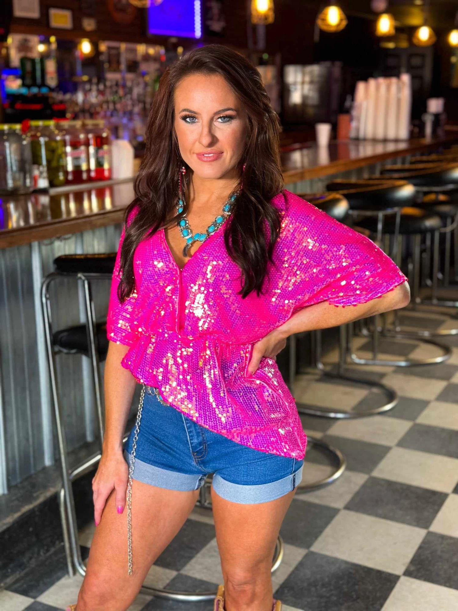 Talk about figure flattering! This sequin babydoll top features a wrap neckline with snap closure and loose sleeves and middle for a flowy flattering fit! Dress it down for a casual lunch with friends or dress it up to wear to work or the club, this babydoll top can go wherever the party takes you!