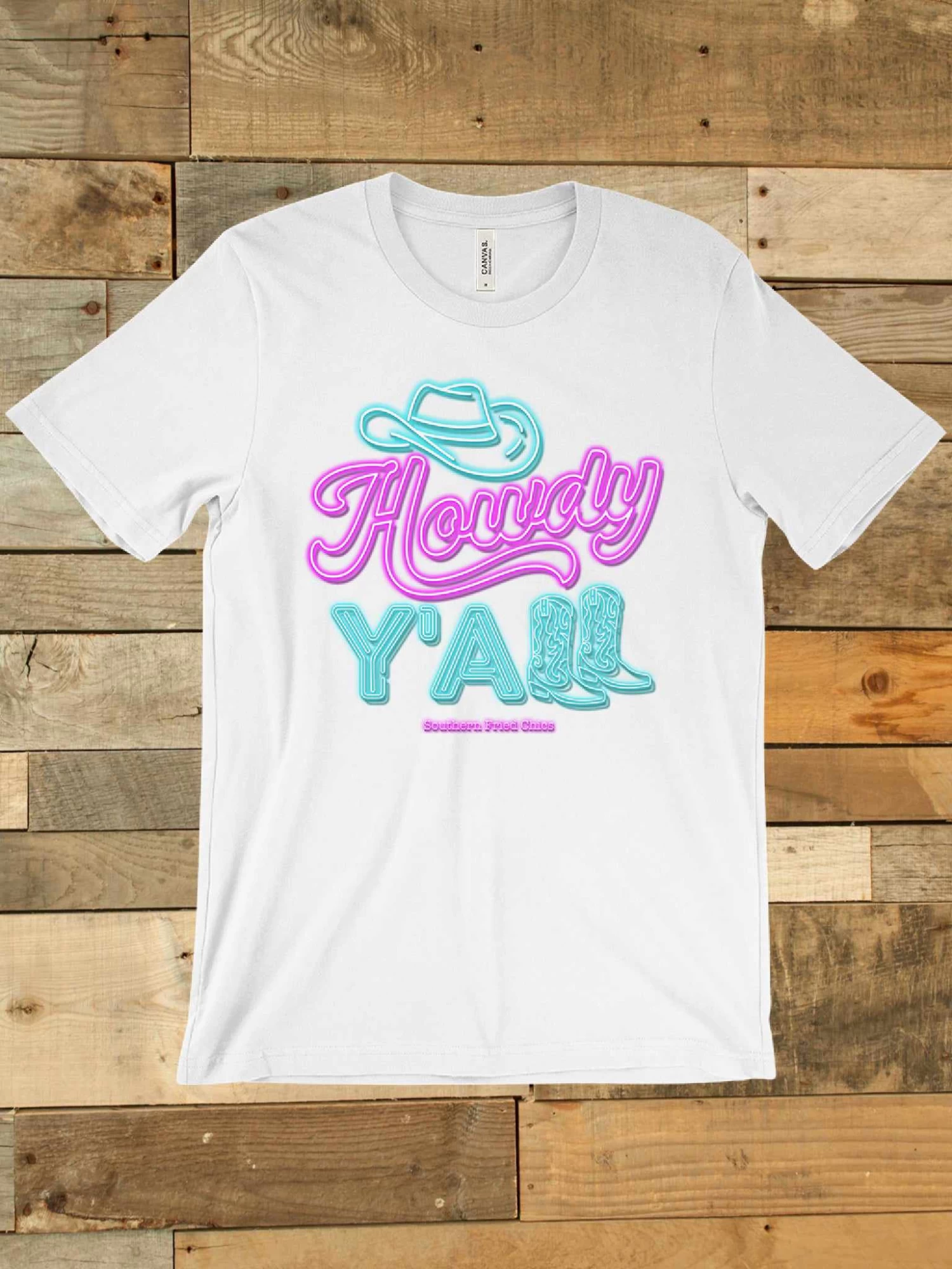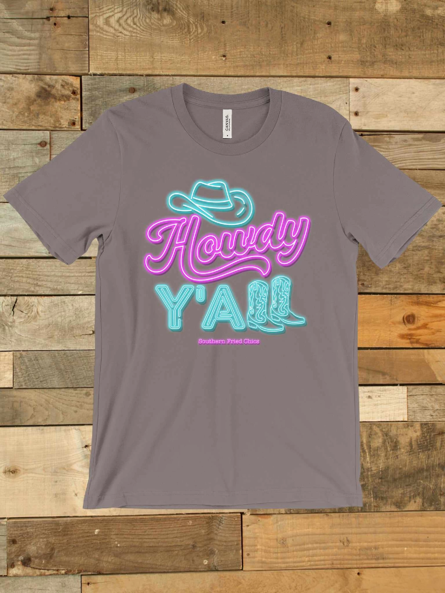 Hey Y’all, you know every country girl needs this tee! This “Howdy Y’all” t-shirt is made of soft cozy cotton and comes in white or asphalt. Topped with a turquoise cowgirl hat and finished off with western boot L’s, this tee makes a great gift for anyone who loves a good southern accent!