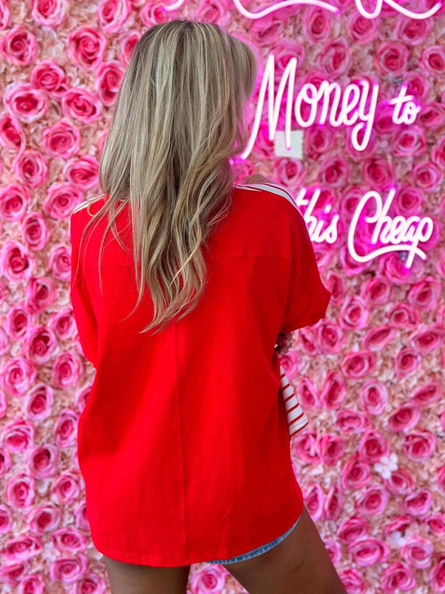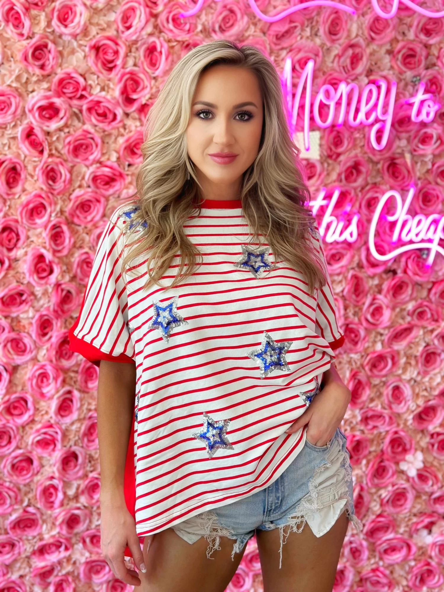 Make a statement of true American pride this summer with our Old Glory Stars and Stripes Top! Featuring a loose fit cotton top– perfect for keeping cool in the heat of the season– you’ll love this showstopper of a top, boasting bold red and white stripes glimmering with blue and silver sequin stars. Put your patriotism on blast and stay comfy all day long! 🇺🇸