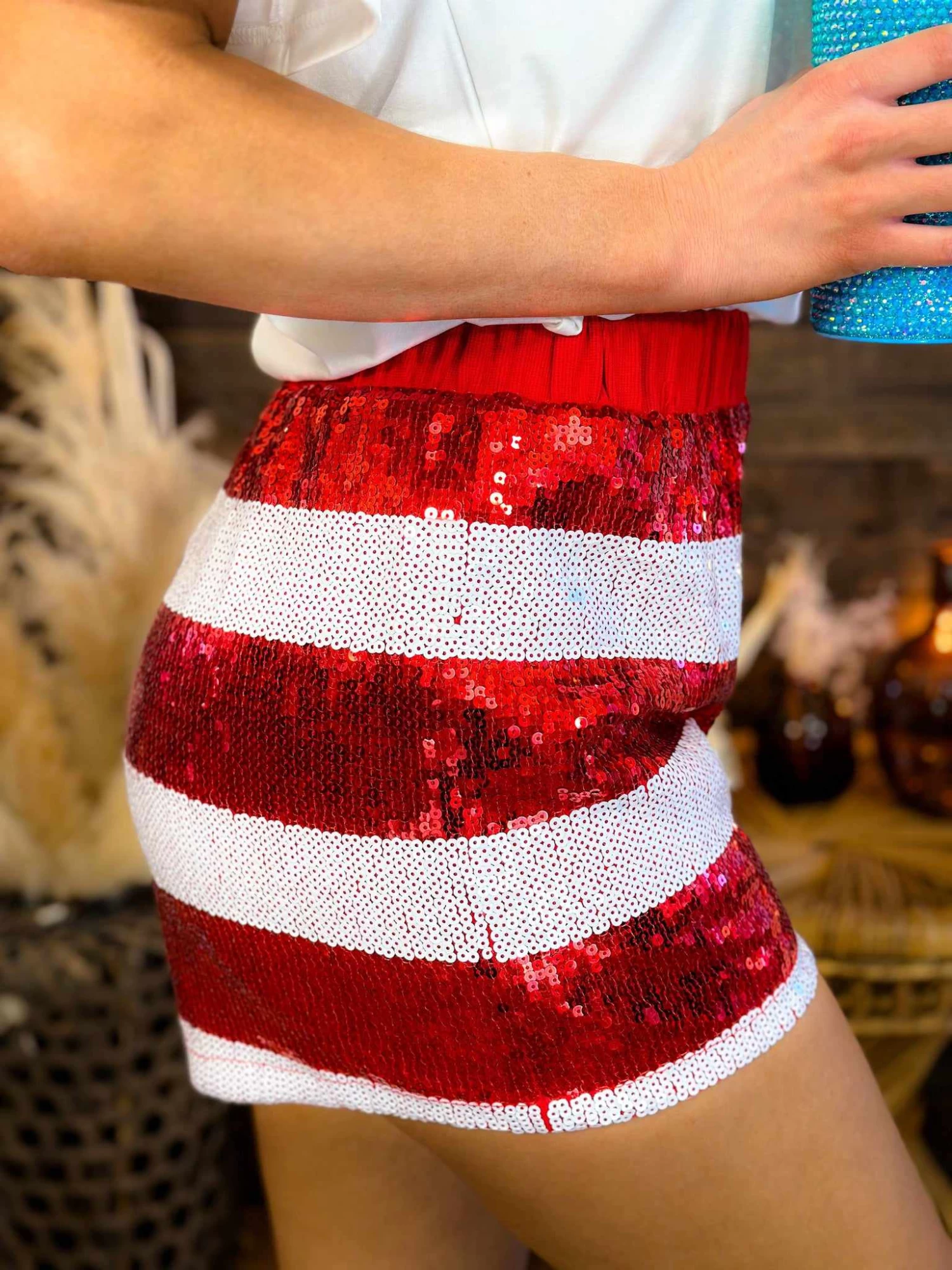 Patriotic all year round! You will always be prepared for your next America themed party or celebration in these red and white sequin striped shorts! These shorts are lined and feature an elastic waistband for better comfort! Perfect for the fourth of July, Memorial Day, and so many other patriotic holidays! These must have shorts pair perfectly with the “Takin Shots” Tee!Â