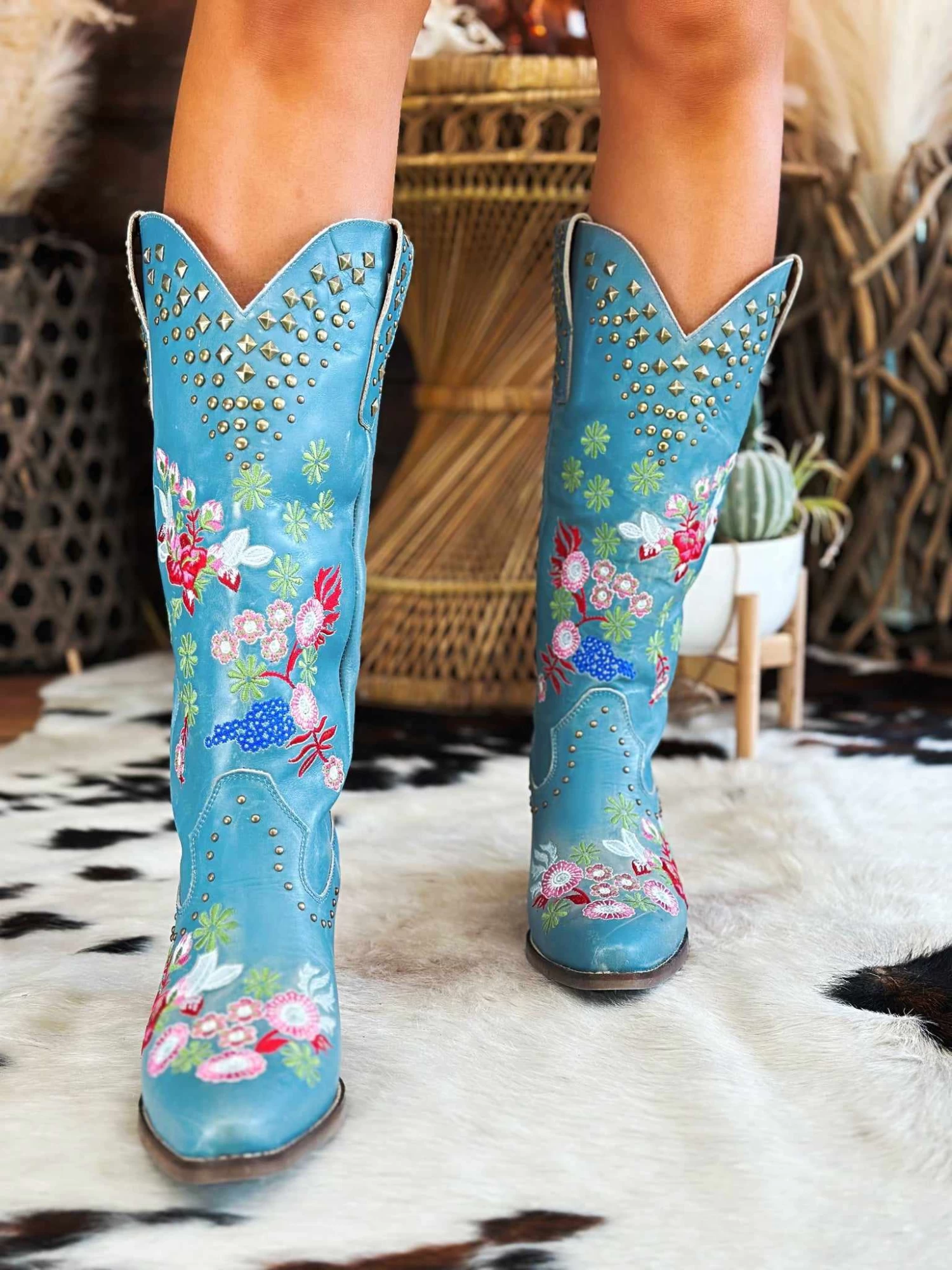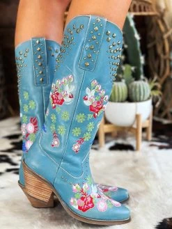 Stud and Floral Blue Leather Boots