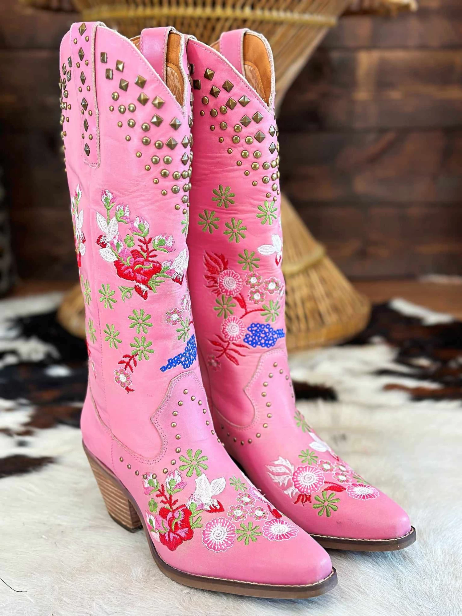 Poppy Studded Boots – they leave you SPEECHLESS! Kick up your look with these sassy Poppy Studded Boots by Dan Post! Embroidered with a cute pink floral detail, these leather beauties are perfect for making a statement with your summer cowgirl style. With its comfy cowboy heel and snip toe, you’ll be dancin’ all night in these boot-scootin’ must-have’s! Made by Dingo from Dan Post.Â