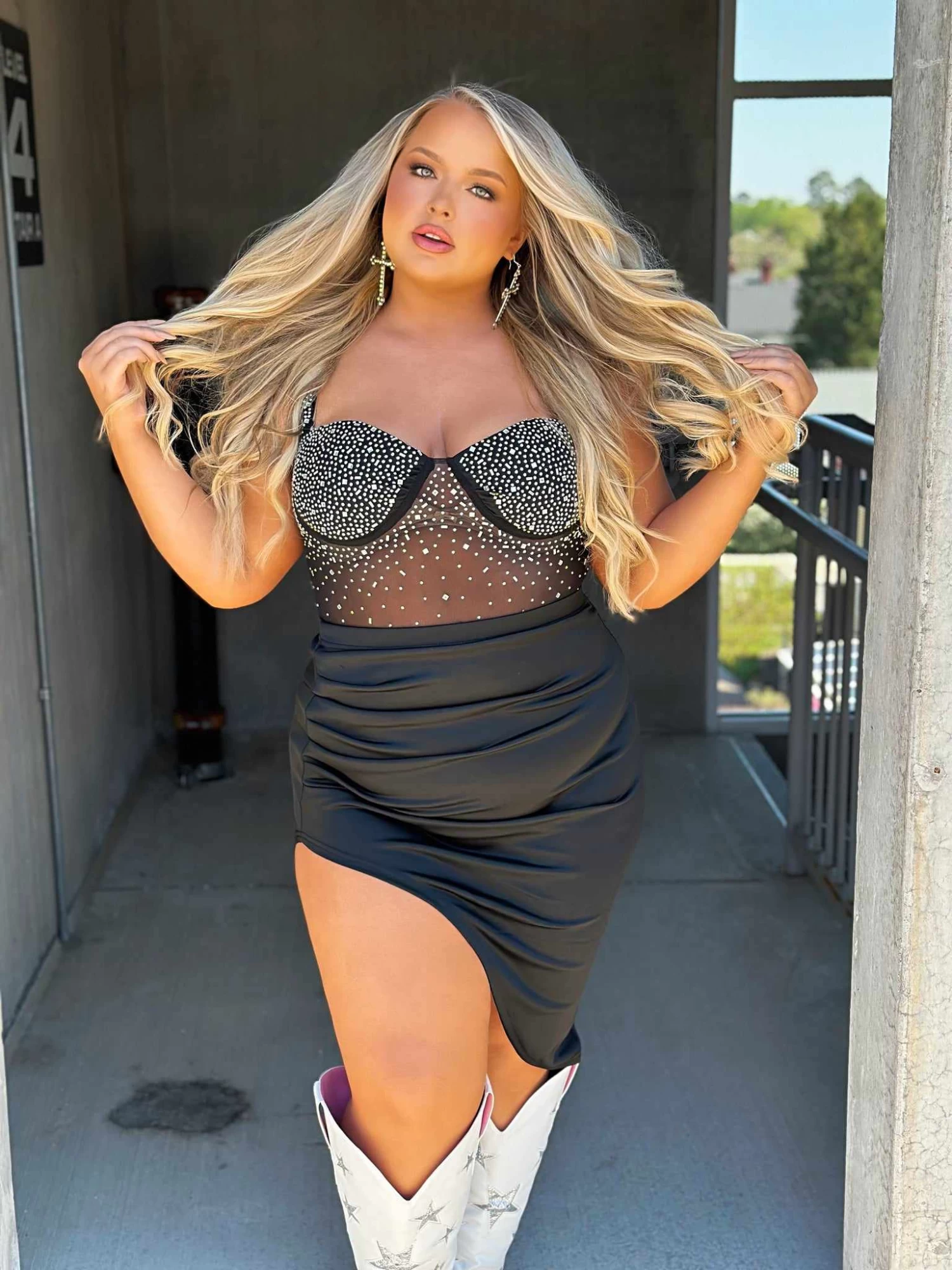 Wow! This set is a must have! A mesh bodysuit with adjustable straps and a thong bottom. Pair it with the high low skirt! If you aren’t feeling a skirt, you can pair it with your favorite denim jeans or shorts! This black color rhinestones and stud bodysuit and skirt set is HOT HOT HOT! This bodysuit features premium studs and rhinestones that sparkle with every strut you make! You will turn heads in this smokeshow!