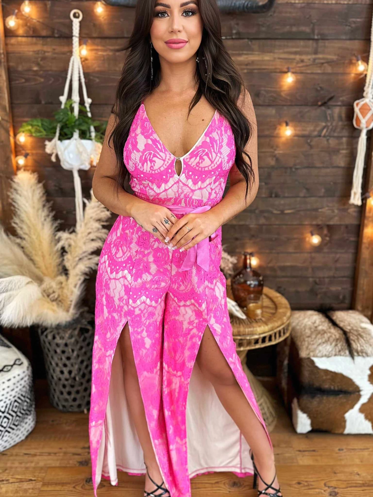 Pink Lace Jumpsuit with Open Leg Slits