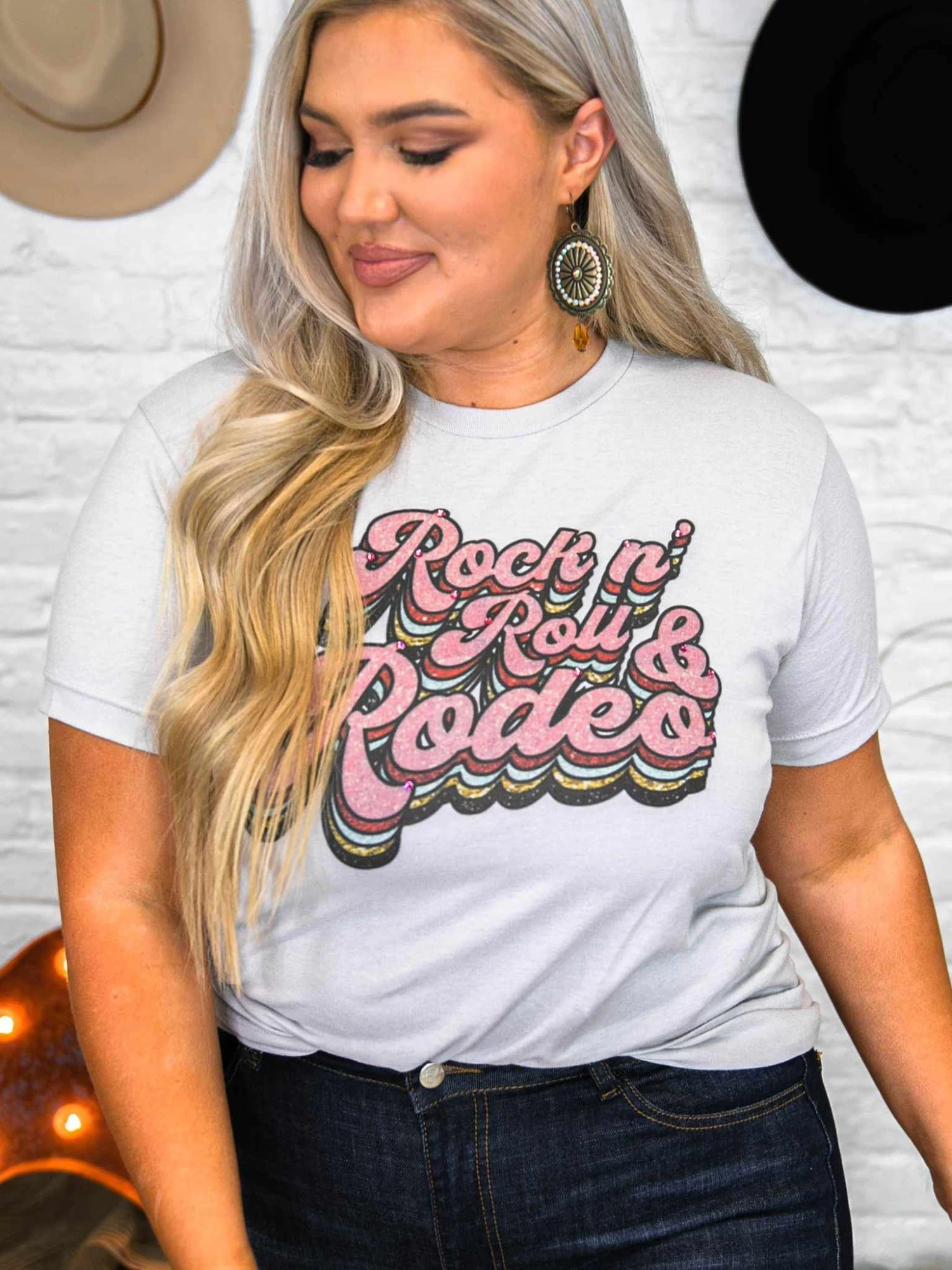 If you love rock n roll and rodeo, this is the tee just for you! Perfect for the edgy cowgirls! The glitter looks real, but it is printed on the tee. True to size, unisex tee. Perfectly paired with leggings or jeans! Bling option available. Printed on a silver-colored tee.