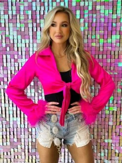 The perfect barbiecore wrap crop top for summer nights on the town! Featuring lapels, a front tie below the bust, and sleeves with pink fur lined cuffs. This is the perfect glam wrap crop top for cool summer nights!