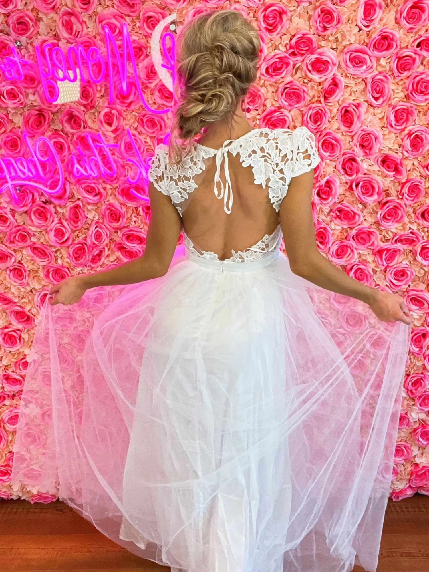 The full-length She’s A Sweetheart is an absolutely gorgeous dress, featuring an open back for a sexy take on a classic style.  Complete the look with the Looking Glass Crystal Choker.Â