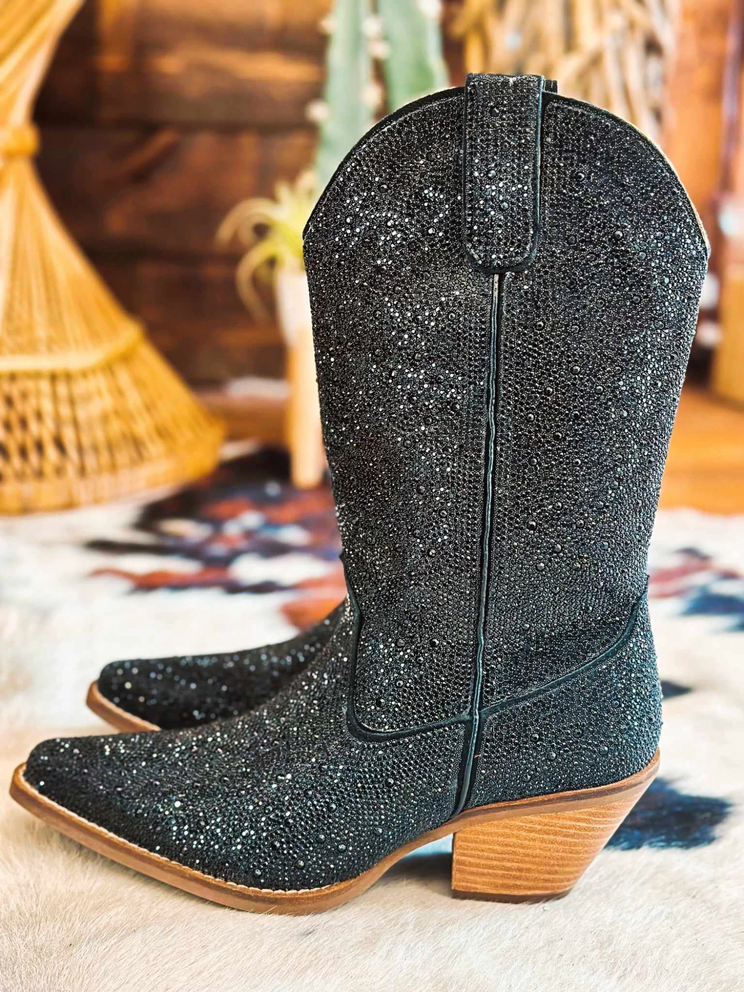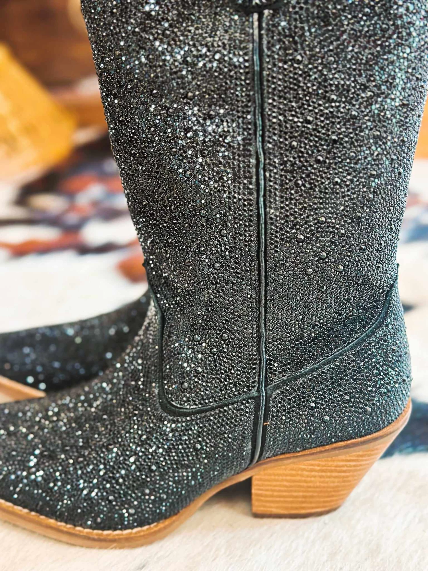 Silver Dollar Boots – they leave you SPEECHLESS! These Silver Dollar Rhinestone Boot by Dan Post are an absolute show-stopper! Saddle up and ride wild in these black rhinestone cowgirl boots, and be sure to shine bright at the next rodeo. Perfect for line dancing or any other hoedown you have planned in your future! Get ready to shine like a diamond in the rough! Made by Dingo from Dan Post.Â