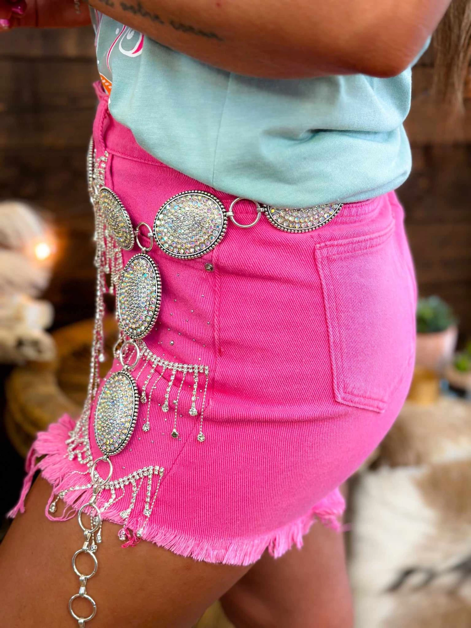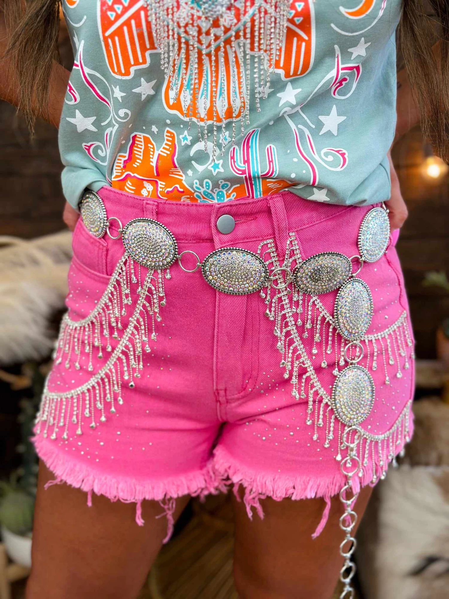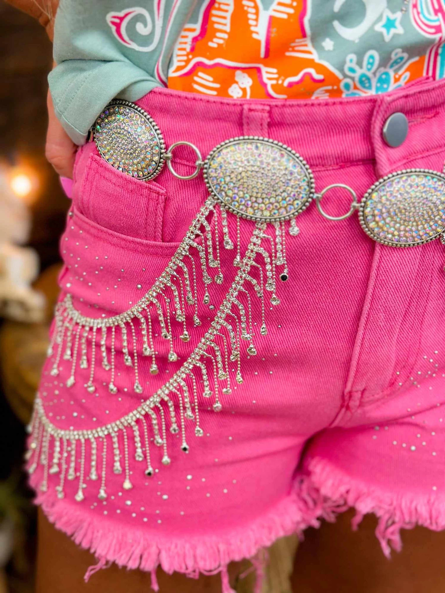 These pink jean shorts with rhinestone details prove you can never have too much bling! Featuring a distressed hem, rhinestone studs, and double swoops of sparkling rhinestone fringe. AÂ fun look for festivals, country converts or any summer event!Â