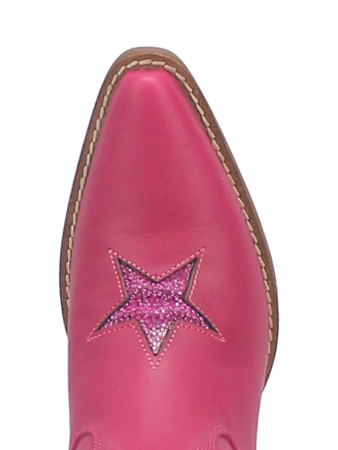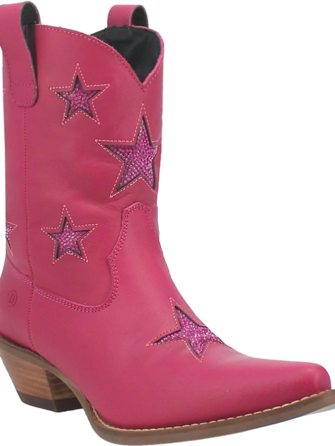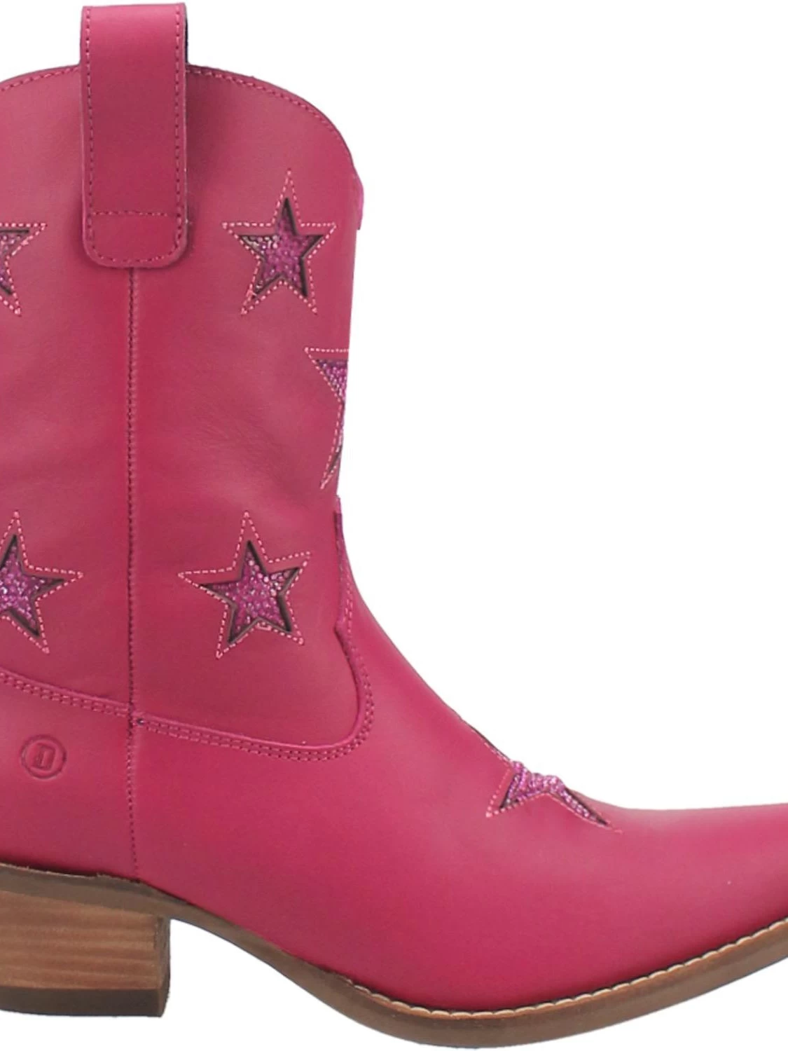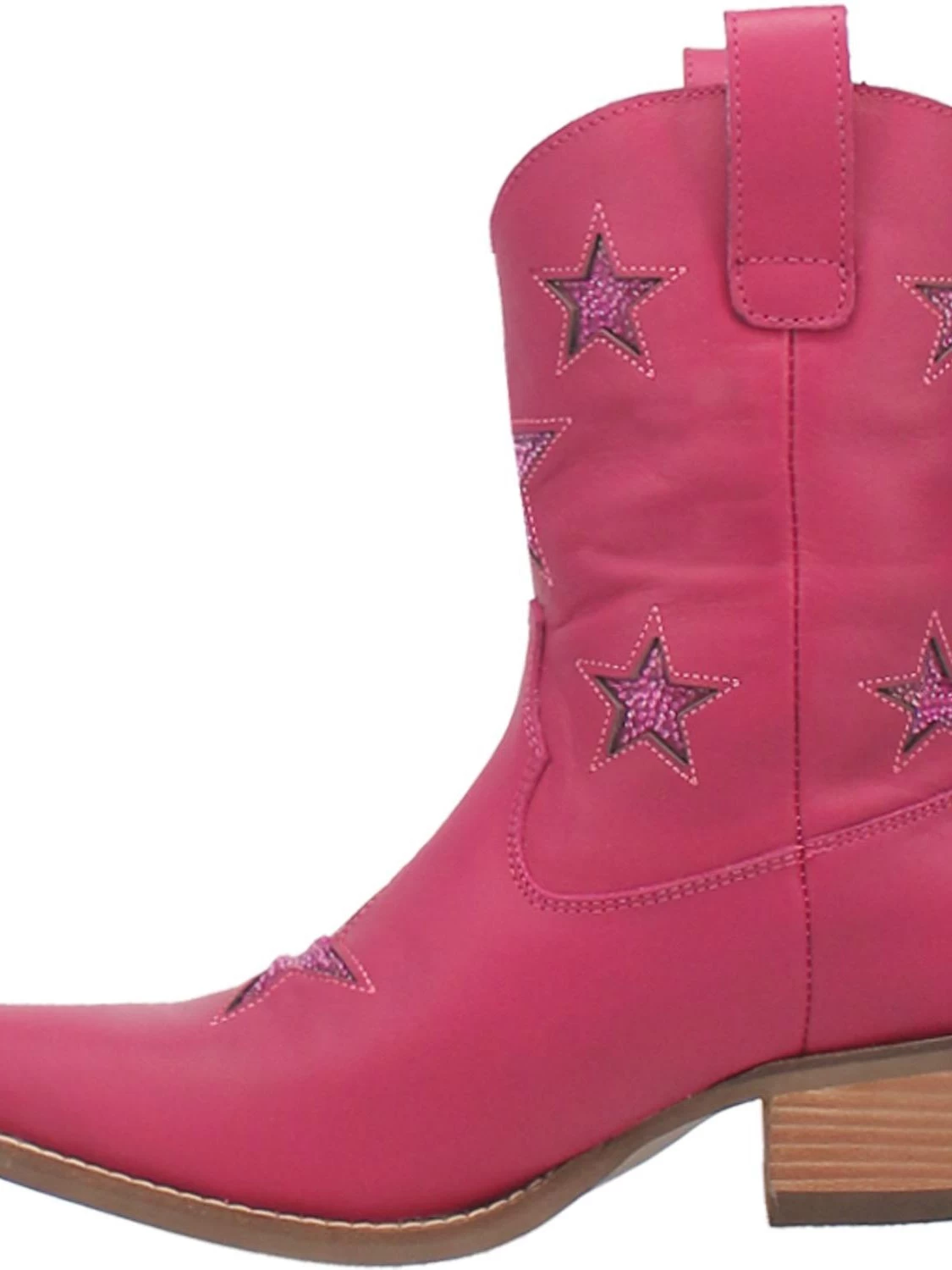 Star Struck Bootie – star of the show! Blast off in style with the Star Struck Bootie! This sassy, all-fuchsia cowgirl bootie adorns your feet with sparkling glitter bling stars, taking your look to the next constellation. For stellar style year-round, go for these star-studded stunners – you won’t regret it! 🤩 Made by Dingo from Dan Post.Â