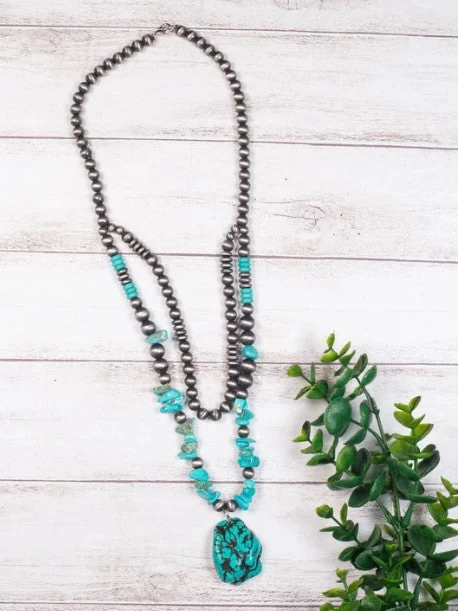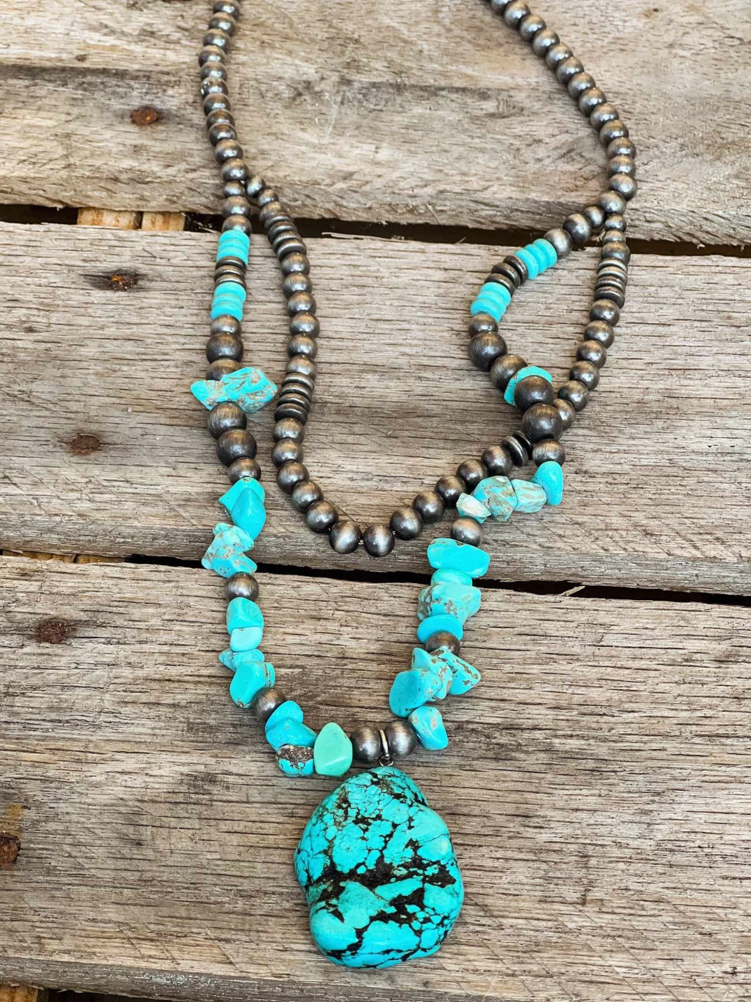 This turquoise stone pendant necklace is big and beautiful! Hanging from a double strand of Navajo pearls, this is a turquoise necklace you will cherish forever.
