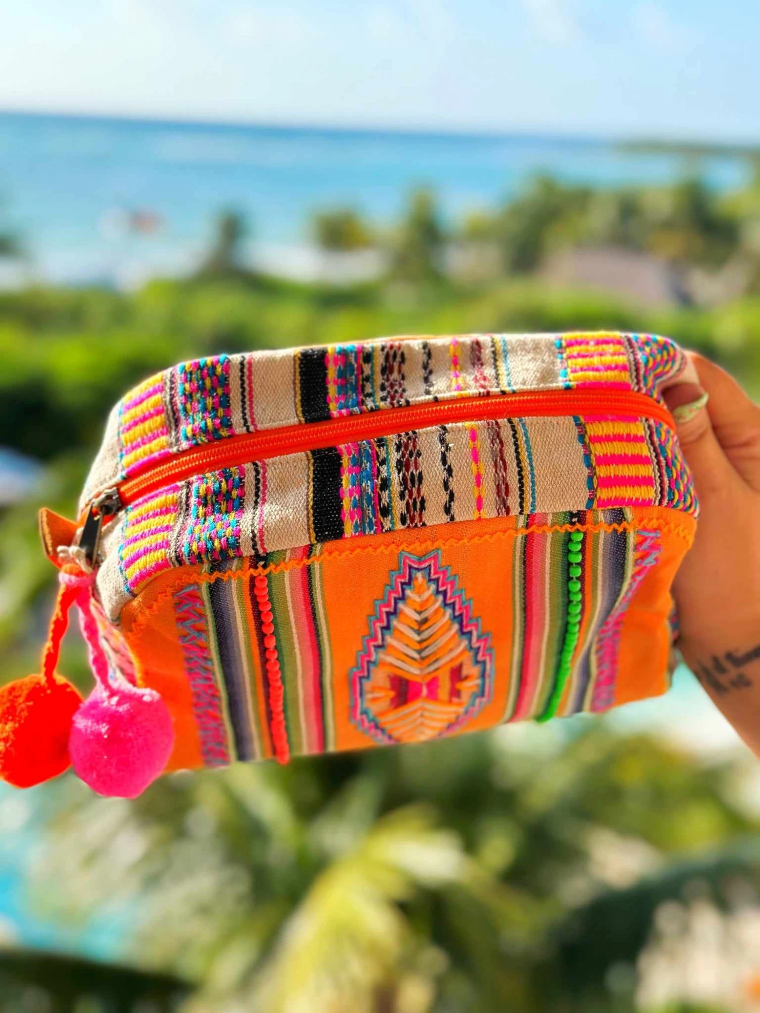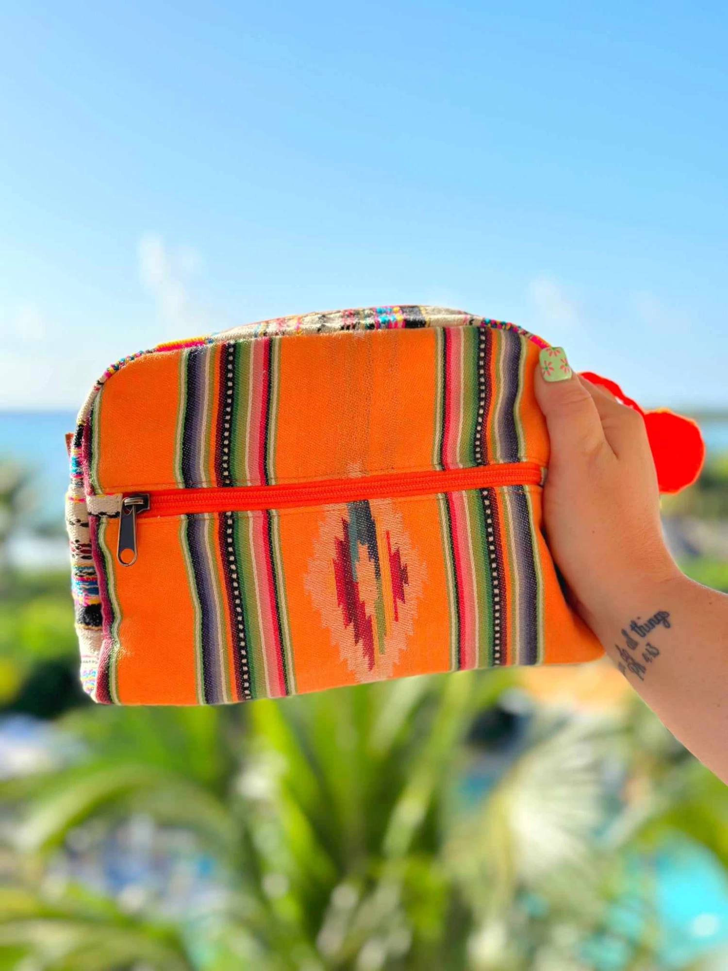 The makeup bag offers the perfect pop of color with an orange-striped Aztec print! With plenty of storage for all your makeup and beauty needs, this bag features natural canvas material, a side pocket, and cute pom-pom zipper charm!