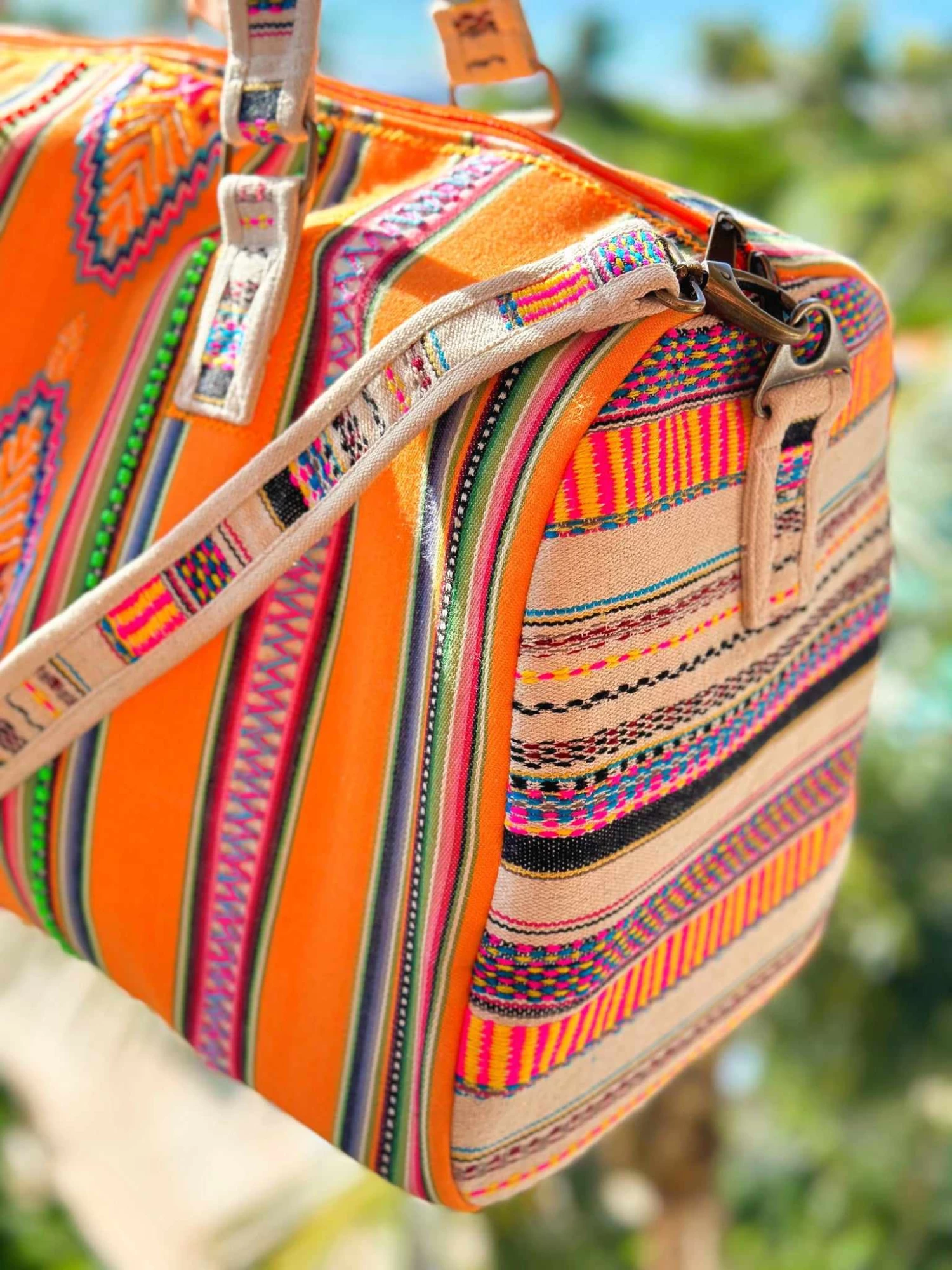 Adventure awaits when you pack up this western style weekender bag! The perfect bag to bring along on your summer vacay, this carry on has tons of storage to carry everything you need far from home. Featuring a fun orange striped aztec print, canvas material, and adjustable straps.
